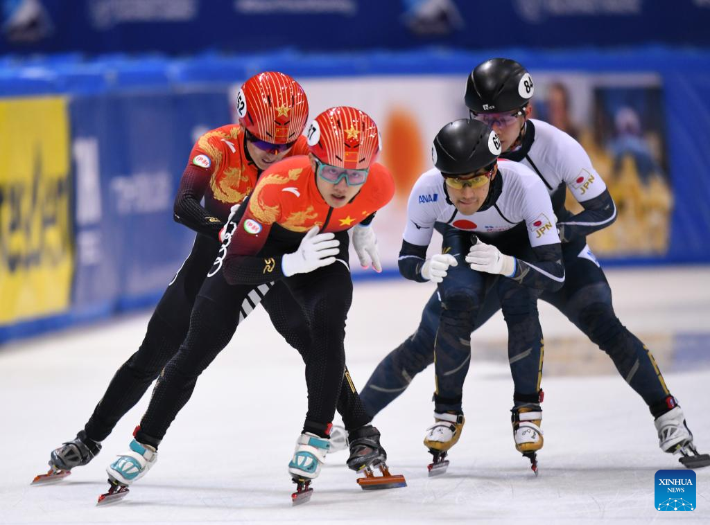 Zhong Yuchen (front) of China competes during the preliminary of men's 1000m at the ISU World Cup Short Track Speed Skating series in Dresden, Germany, Feb. 3, 2023. (Xinhua/Ren Pengfei)