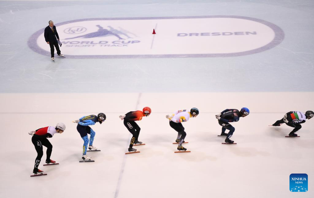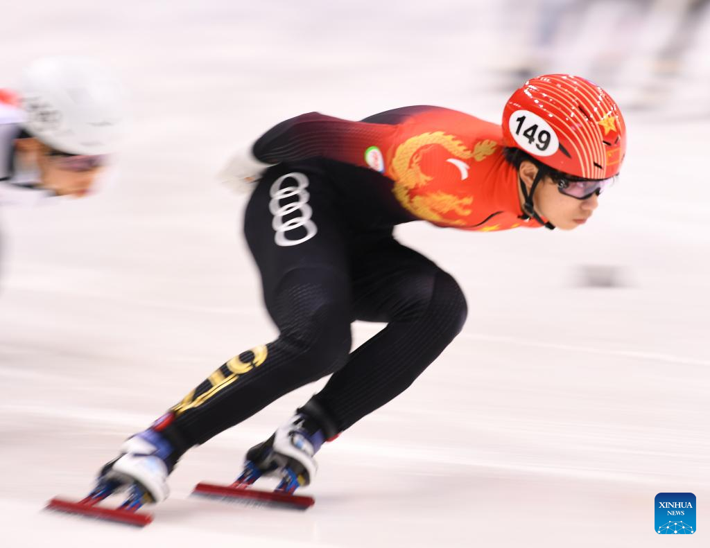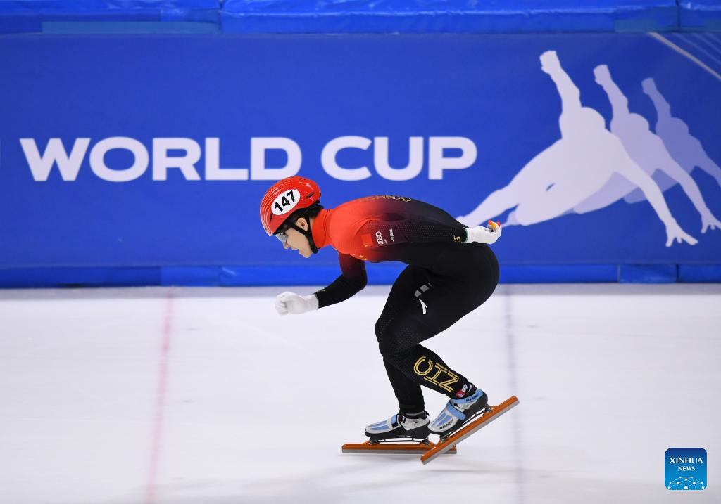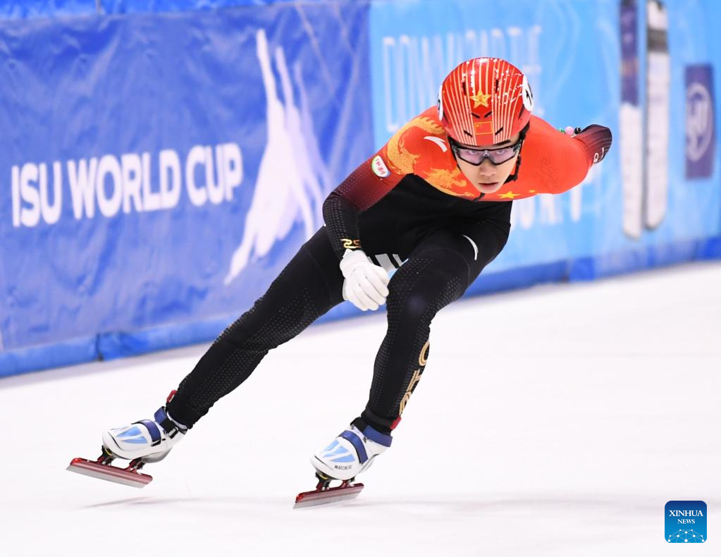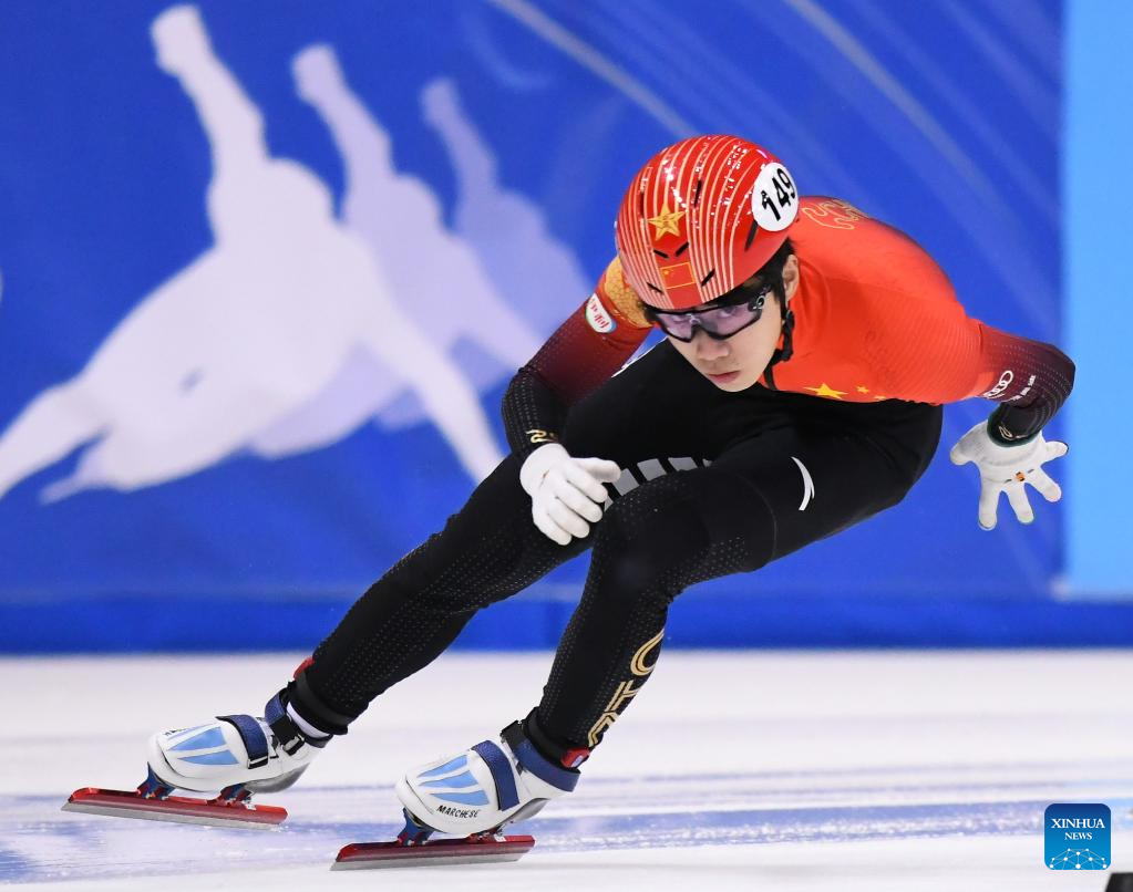 Zhong Yuchen of China competes during the preliminary of men's 1000m at the ISU World Cup Short Track Speed Skating series in Dresden, Germany, Feb. 3, 2023. (Xinhua/Ren Pengfei)