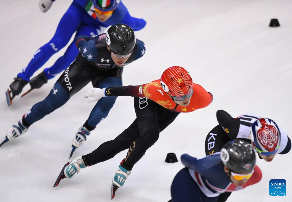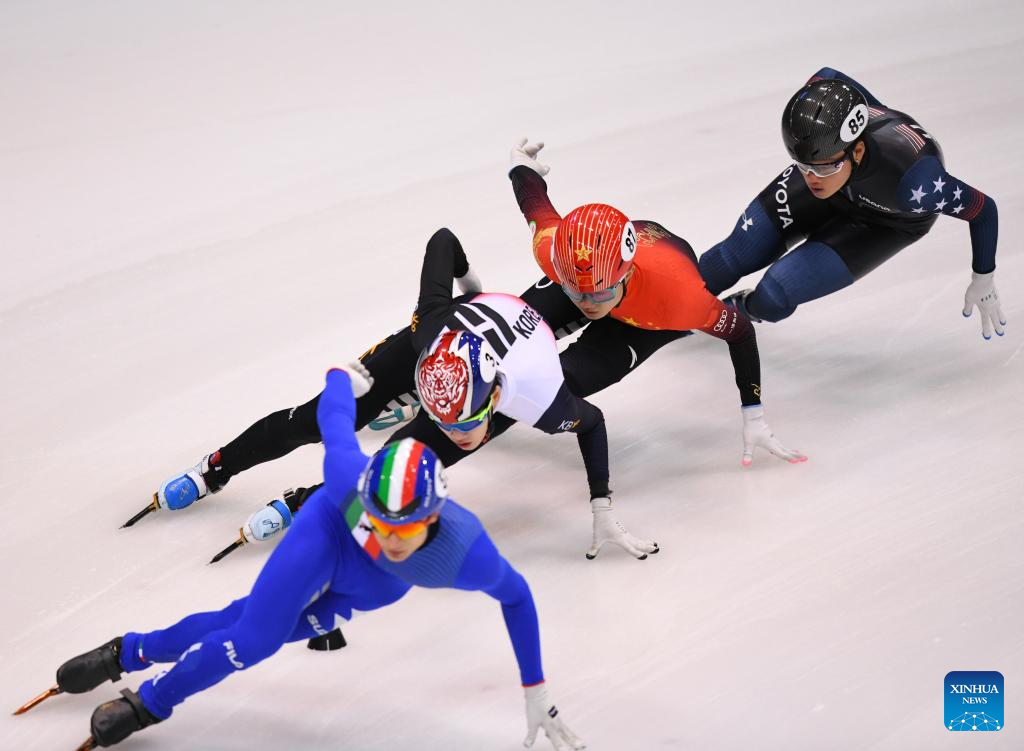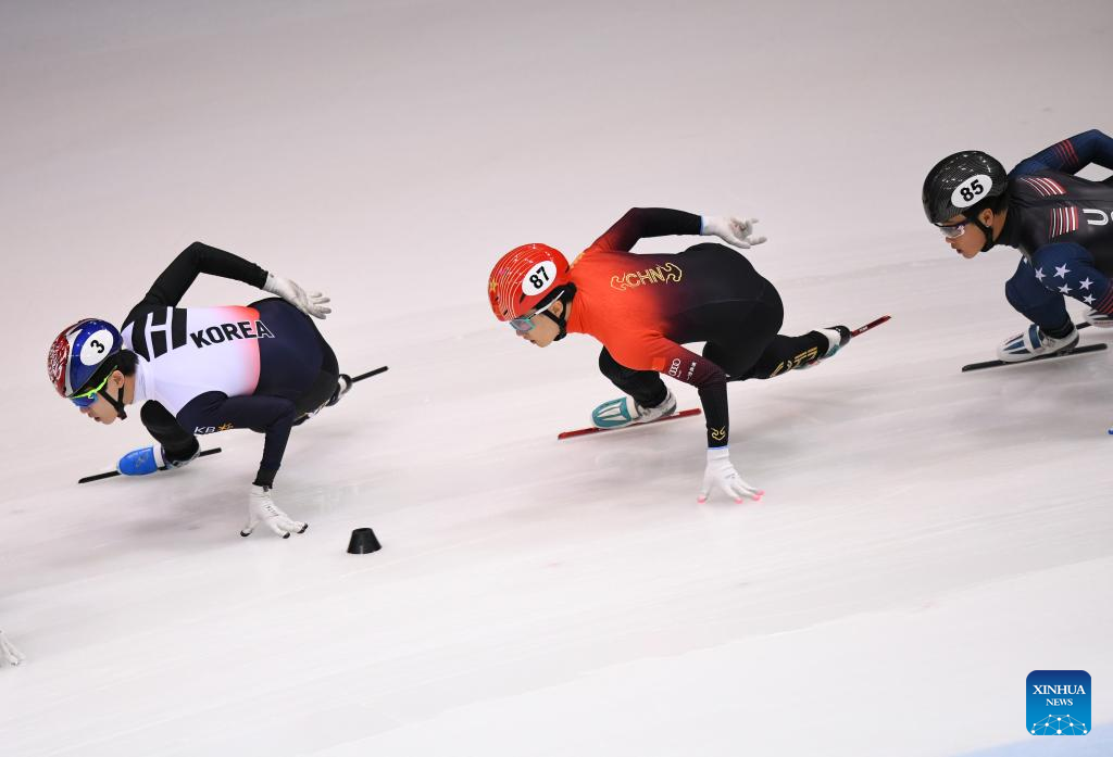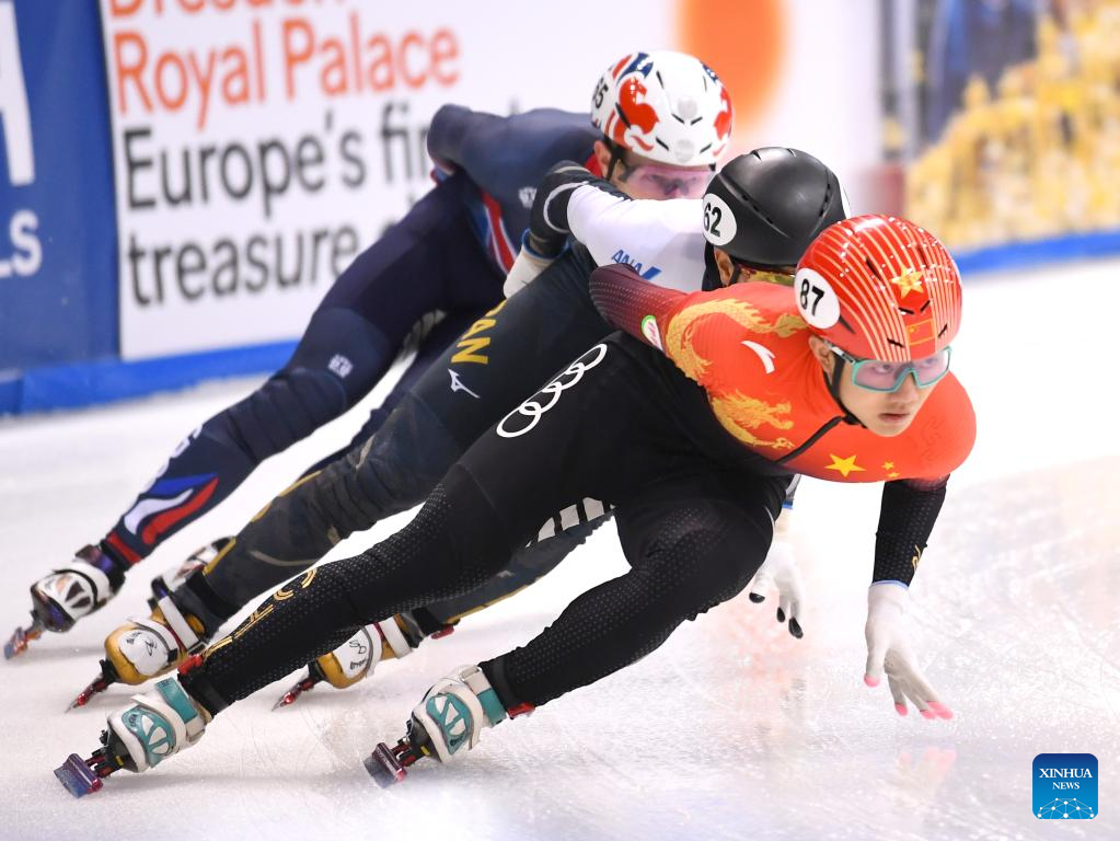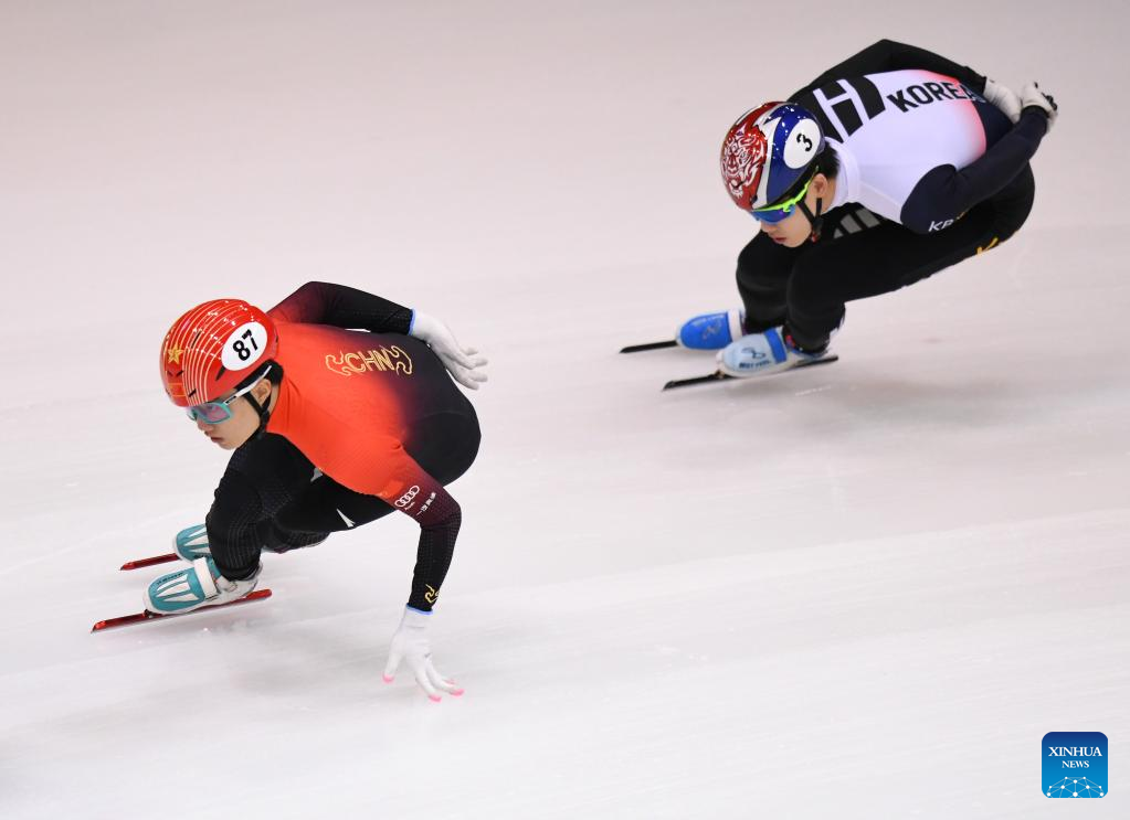Zhong Yuchen of China competes during the preliminary of men's 1000m at the ISU World Cup Short Track Speed Skating series in Dresden, Germany, Feb. 3, 2023. (Xinhua/Ren Pengfei)