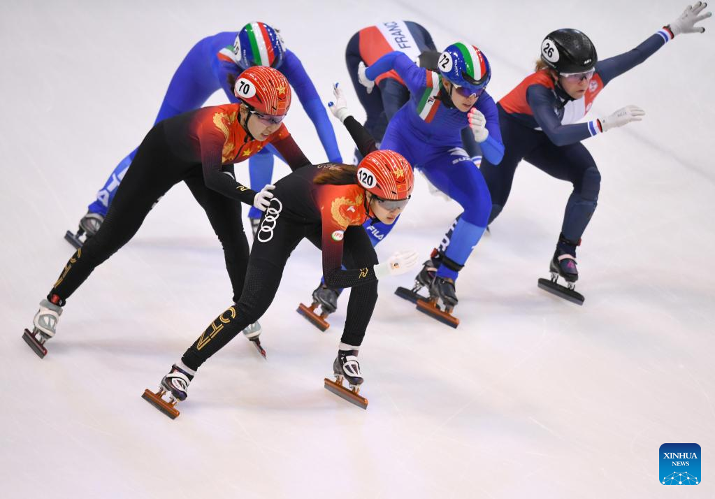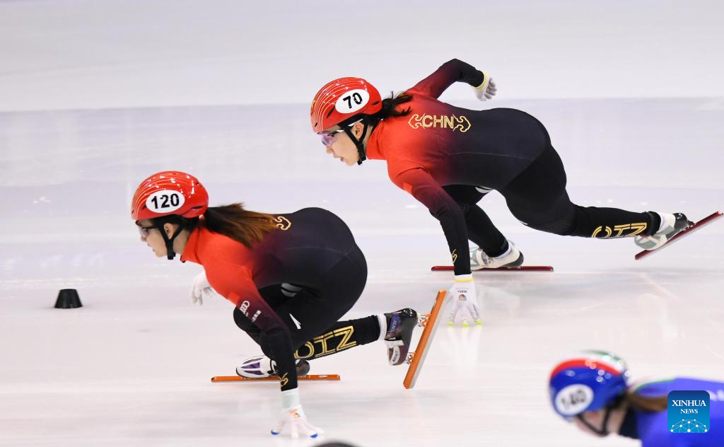 Wang Xinran (2nd R, front) and Zang Yize (2nd R, rear) of China compete during the quarterfinal of women's 3000m relay at the ISU World Cup Short Track Speed Skating series in Dresden, Germany, Feb. 3, 2023. (Xinhua/Ren Pengfei)