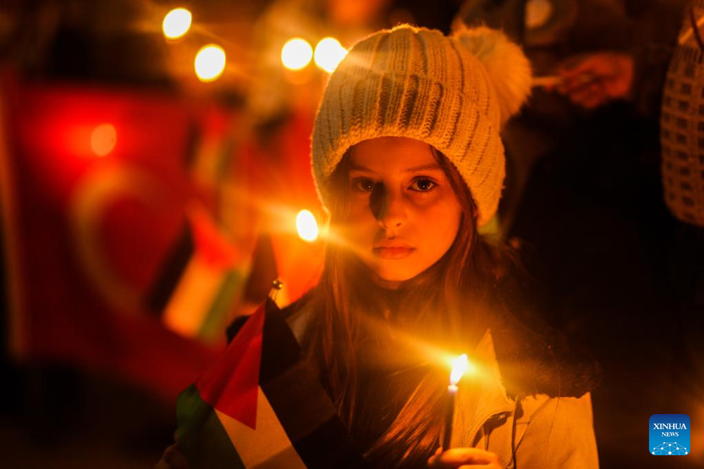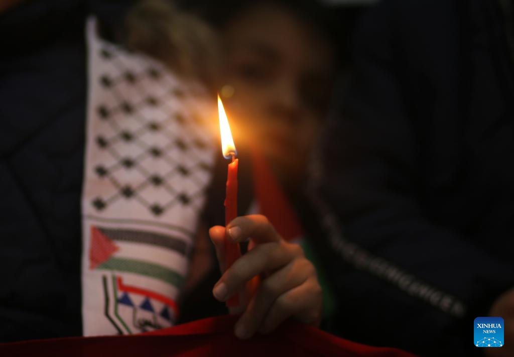 Palestinian children hold candles to mourn victims of the earthquakes in Türkiye and Syria in the southern Gaza Strip city of Khan Younis, on Feb. 7, 2023. More than 5,000 people have been killed and tens of thousands of others injured by the massive earthquakes in Türkiye and Syria. (Photo by Yasser Qudih/Xinhua)