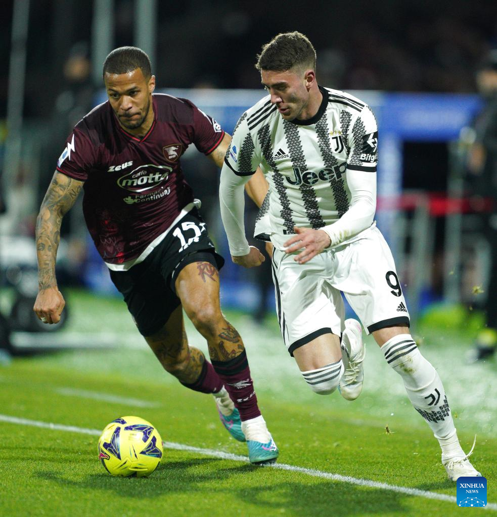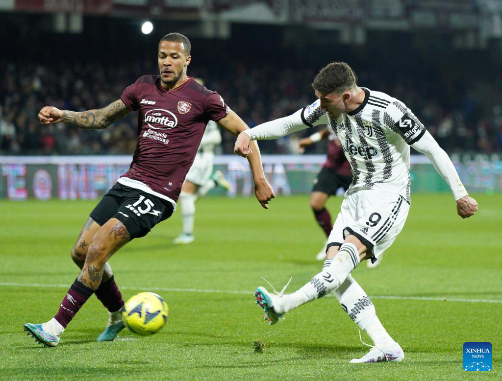 FC Juventus' Dusan Vlahovic (R) vies with Salernitana's Junior Sambia during a Serie A football match between FC Juventus and Salernitana in Salerno, Italy, Feb. 7, 2023. (Str/Xinhua)