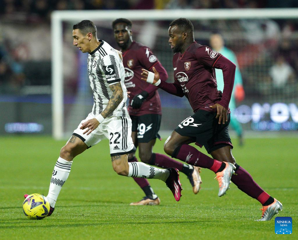 FC Juventus' Angel Di Maria (L) vies with Salernitana's Lassana Coulibaly during a Serie A football match between FC Juventus and Salernitana in Salerno, Italy, Feb. 7, 2023. (Str/Xinhua)
