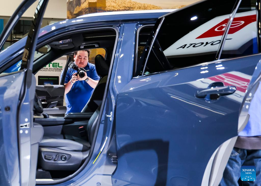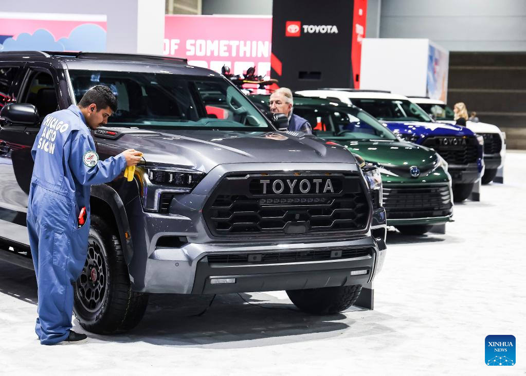 A staff member cleans a Toyota Sequoia vehicle on display during the media preview of Chicago Auto Show in Chicago, the United States, Feb. 9, 2023.