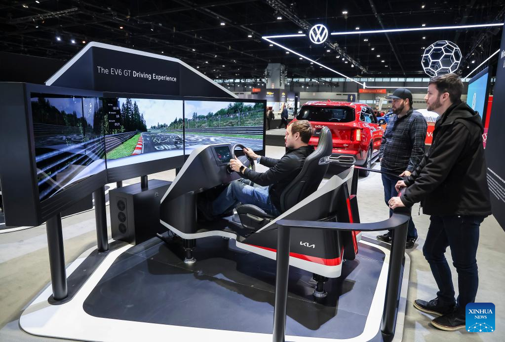 Journalists try out a virtual race in a KIA EV6 during the media preview of Chicago Auto Show in Chicago, the United States, Feb. 9, 2023.