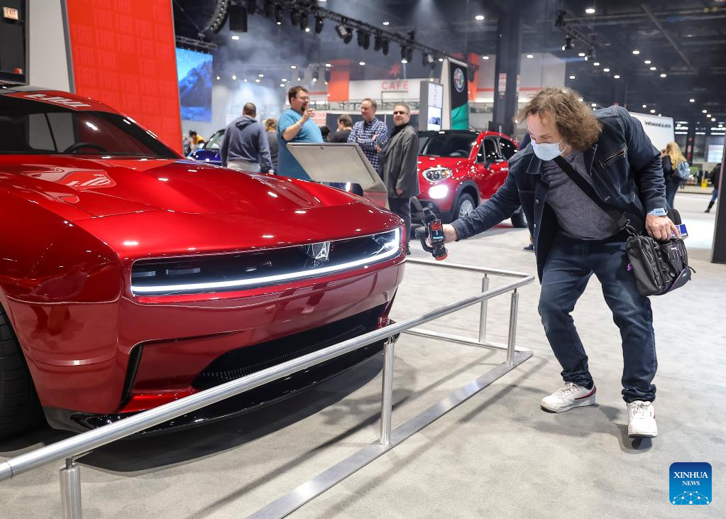 A Dodge Charger Daytona SRT vehicle is on display during the media preview of Chicago Auto Show in Chicago, the United States, Feb. 9, 2023.