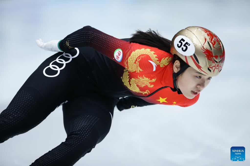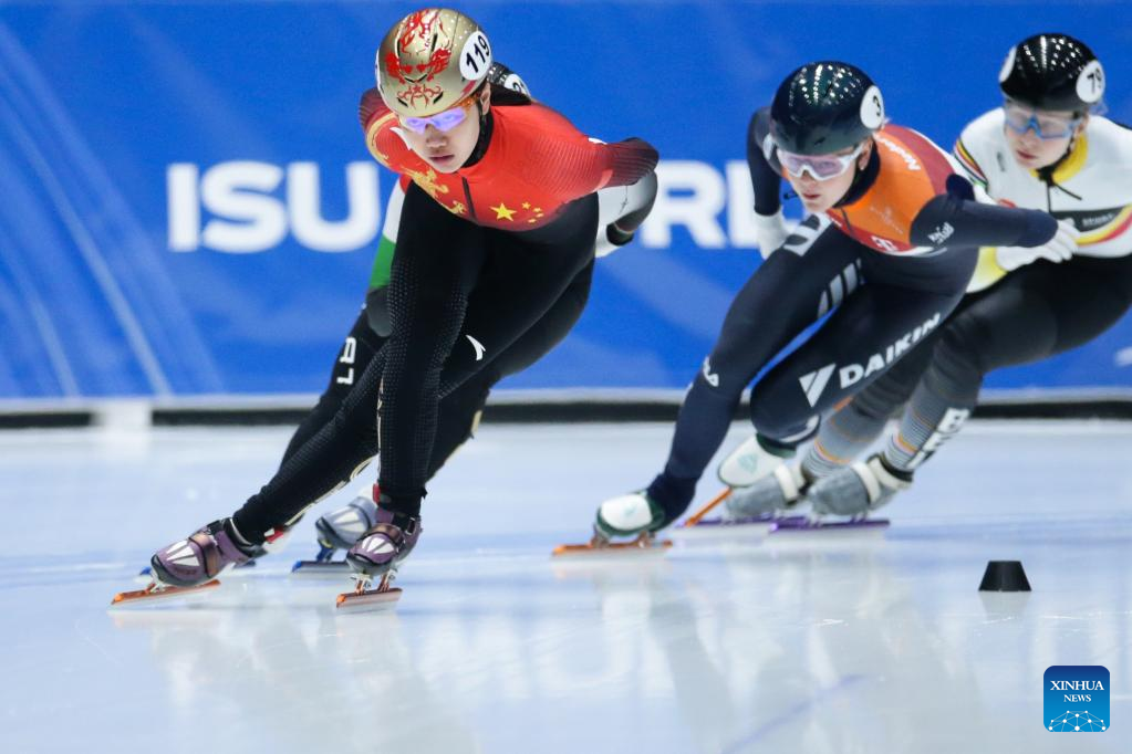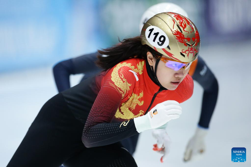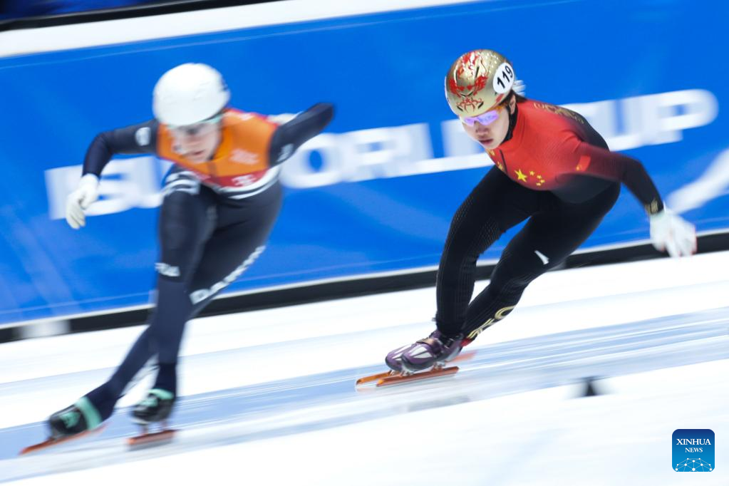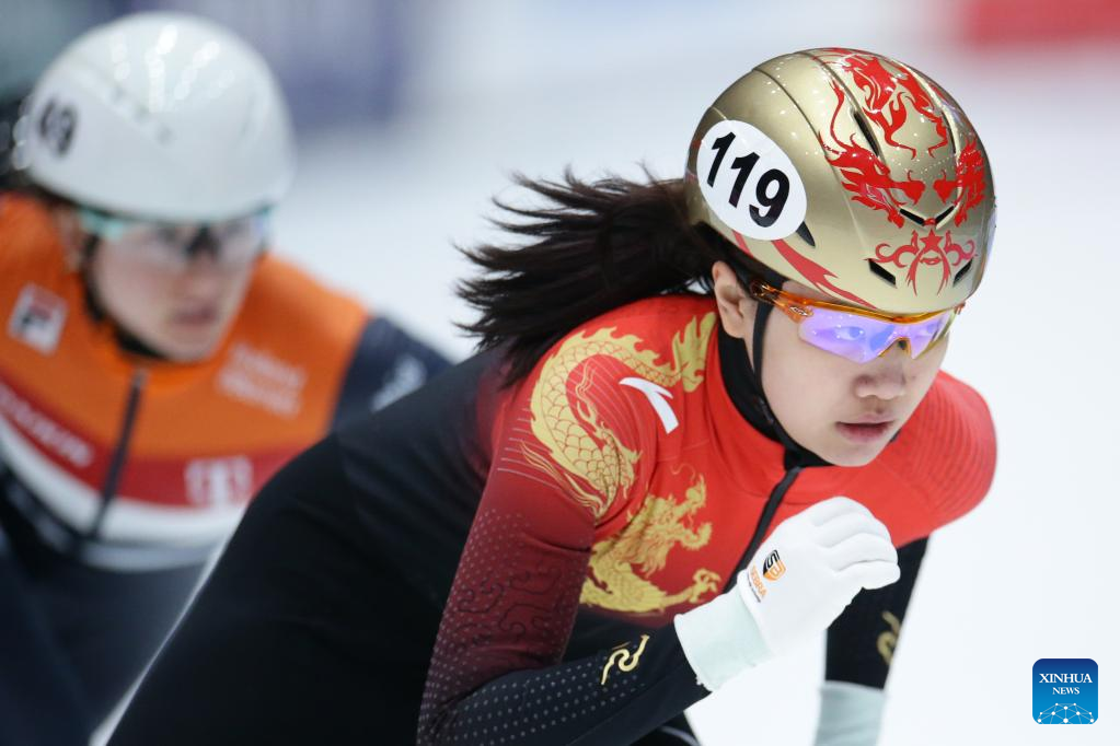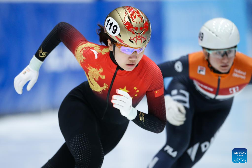 Wang Ye of China competes during the quarterfinal of women's 1000m at the ISU World Cup Short Track Speed Skating series in Dordrecht, the Netherlands, Feb. 11, 2023. (Xinhua/Zheng Huansong)