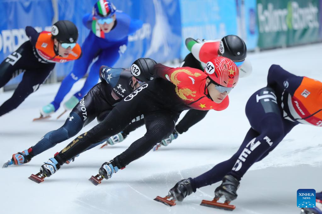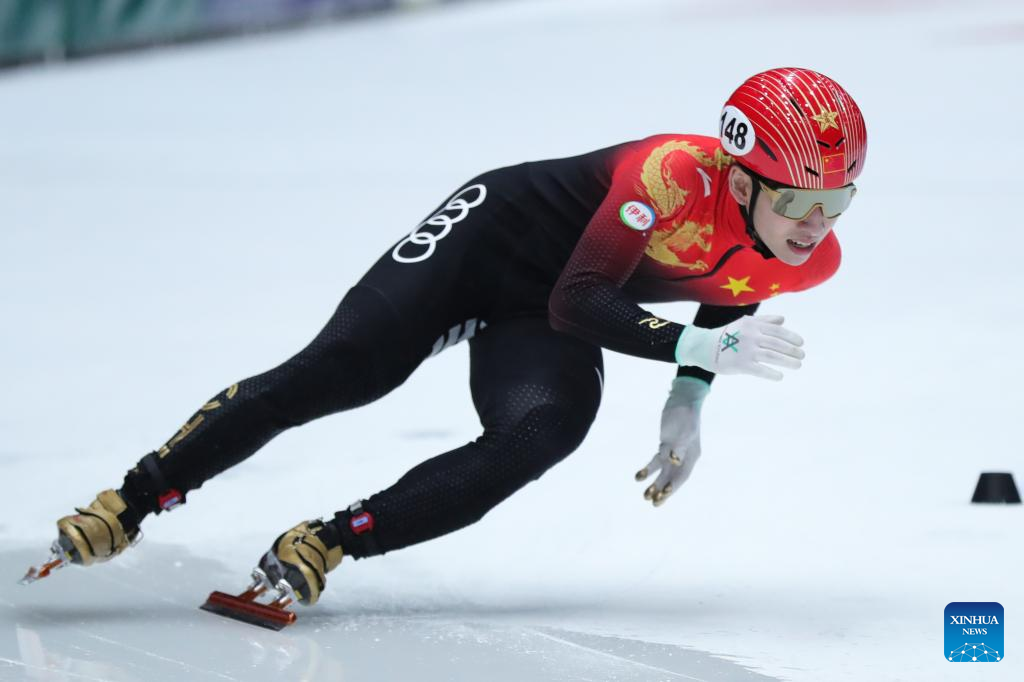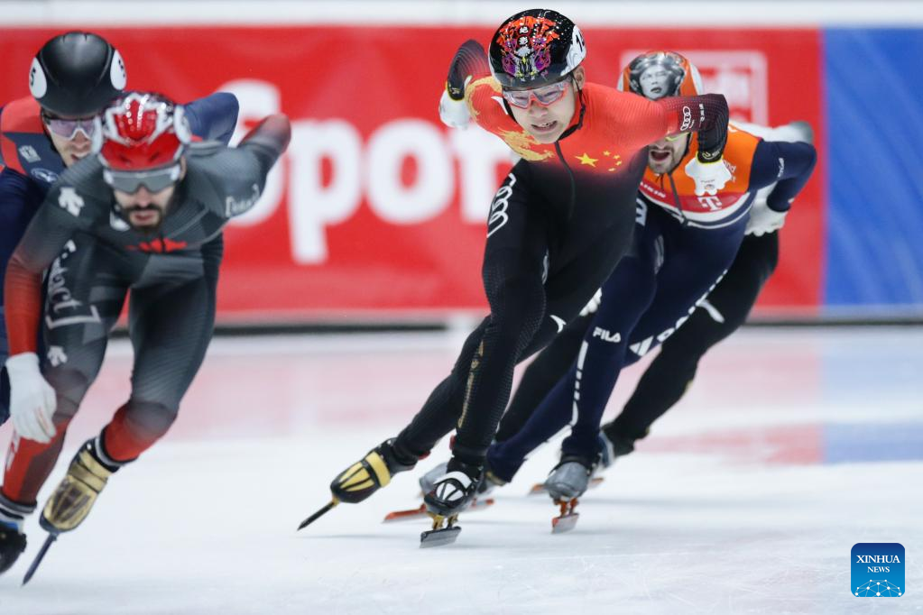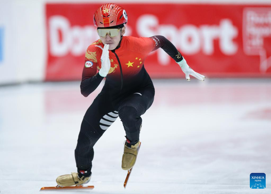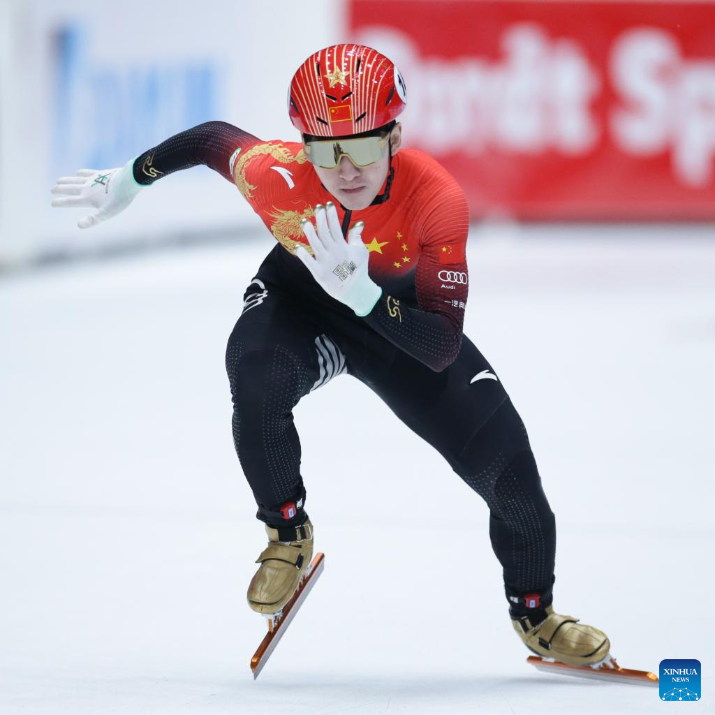 Lin Xiaojun of China competes during the quarterfinal of men's 1000m at the ISU World Cup Short Track Speed Skating series in Dordrecht, the Netherlands, Feb. 11, 2023. (Xinhua/Zheng Huansong)