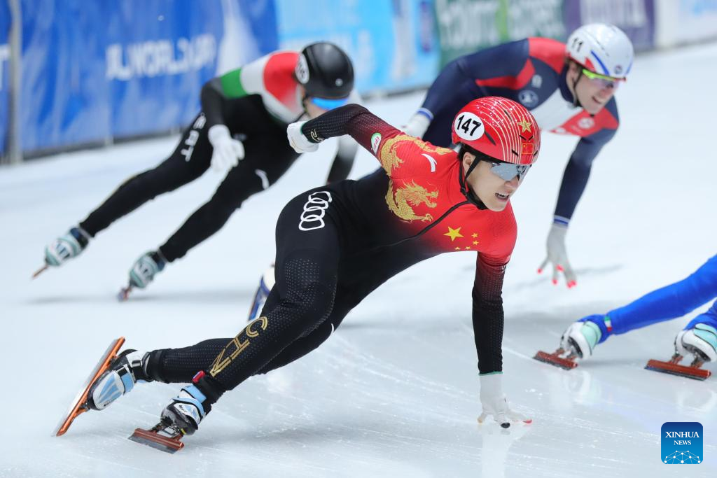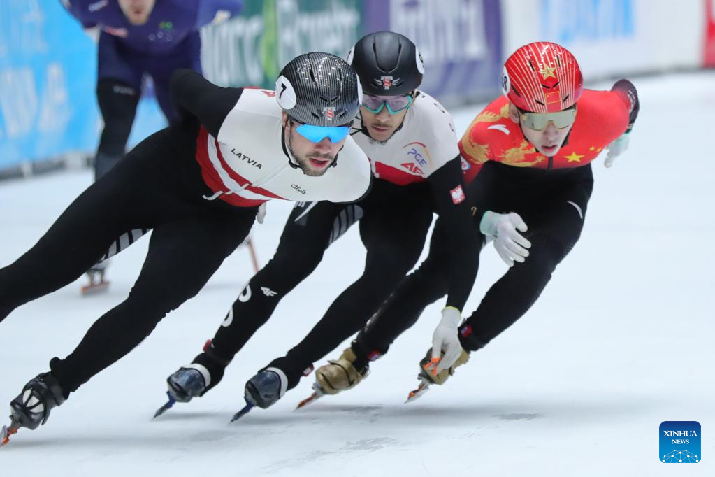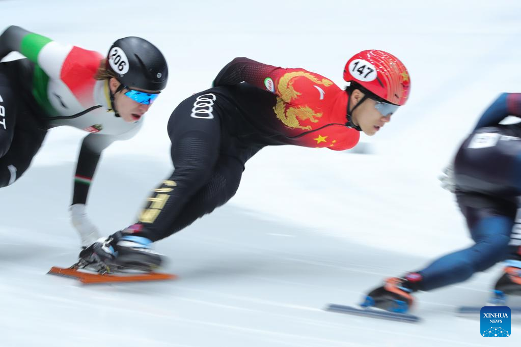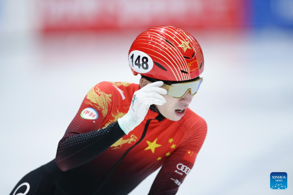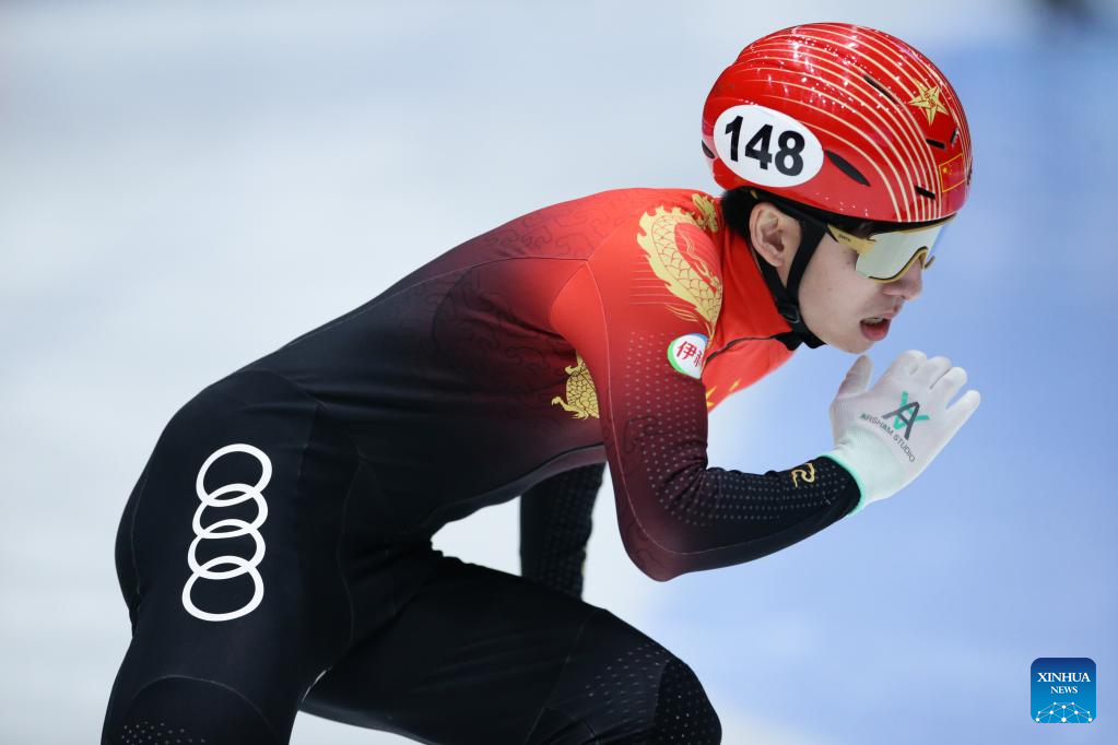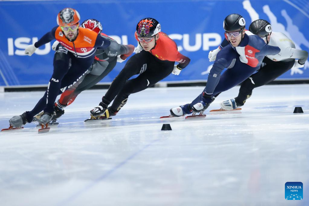 Lin Xiaojun of China competes during the quarterfinal of men's 1000m at the ISU World Cup Short Track Speed Skating series in Dordrecht, the Netherlands, Feb. 11, 2023. (Xinhua/Zheng Huansong)