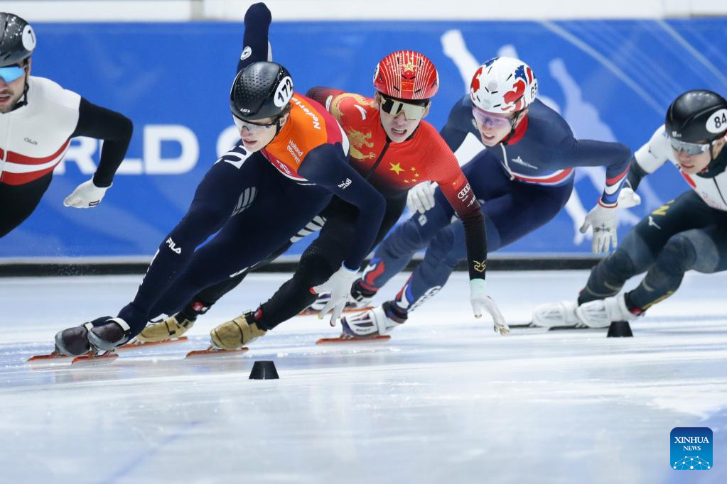 Zhong Yuchen (3rd L) of China competes during the quarterfinal of men's 1000m at the ISU World Cup Short Track Speed Skating series in Dordrecht, the Netherlands, Feb. 11, 2023. (Xinhua/Zheng Huansong)