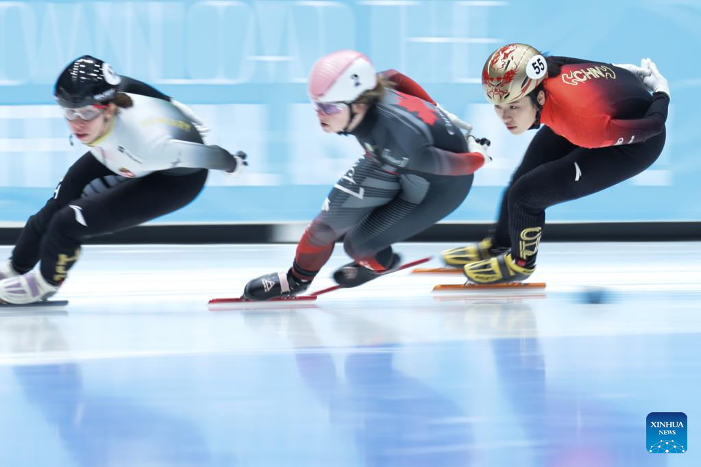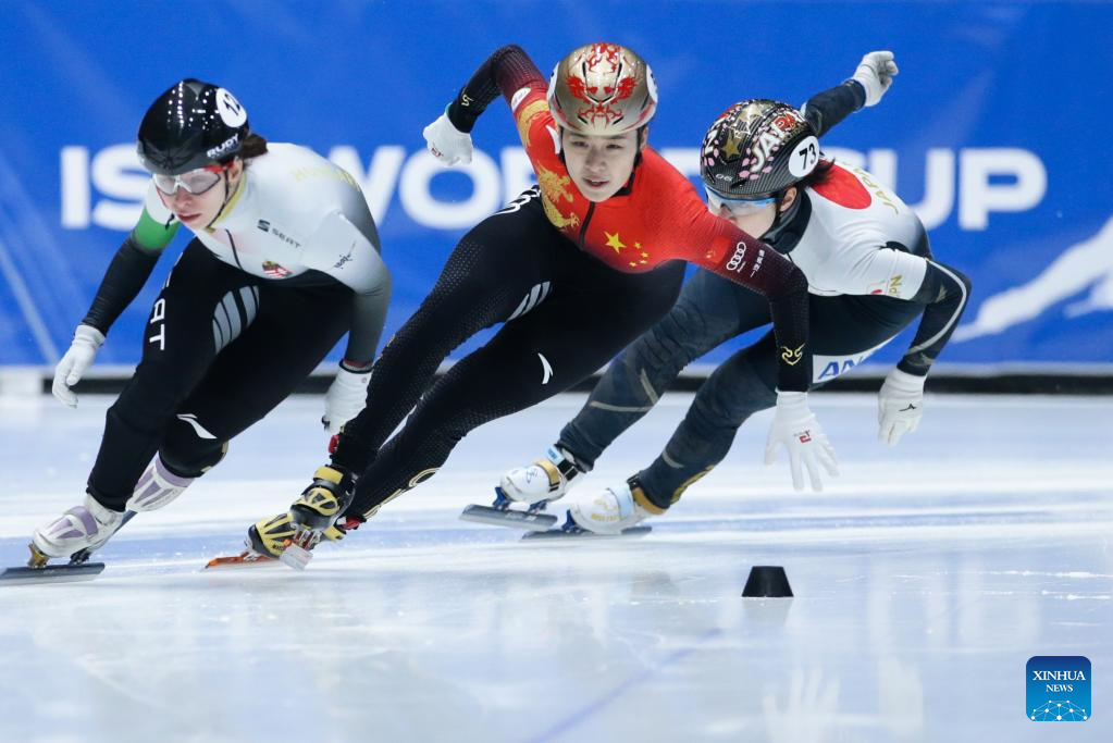 Wang Ye (C) of China competes during the semifinal of women's 1000m at the ISU World Cup Short Track Speed Skating series in Dordrecht, the Netherlands, Feb. 11, 2023. (Xinhua/Zheng Huansong)