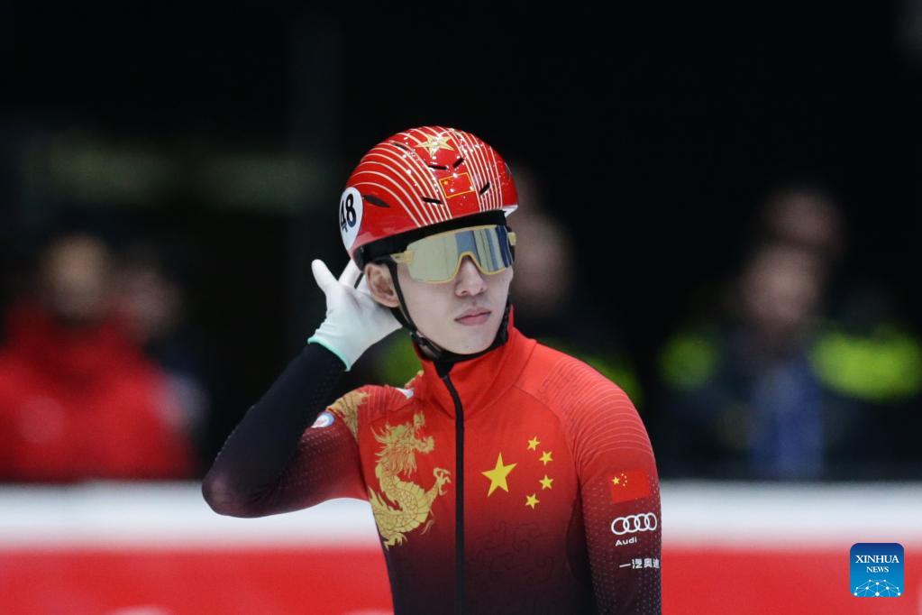 Lin Xiaojun of China reacts before the quarterfinal of men's 1000m at the ISU World Cup Short Track Speed Skating series in Dordrecht, the Netherlands, Feb. 11, 2023. (Xinhua/Zheng Huansong)