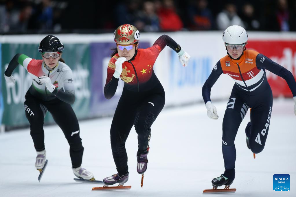 Zhang Chutong (C) of China competes during the quarterfinal of women's 1000m at the ISU World Cup Short Track Speed Skating series in Dordrecht, the Netherlands, Feb. 11, 2023. (Xinhua/Zheng Huansong)