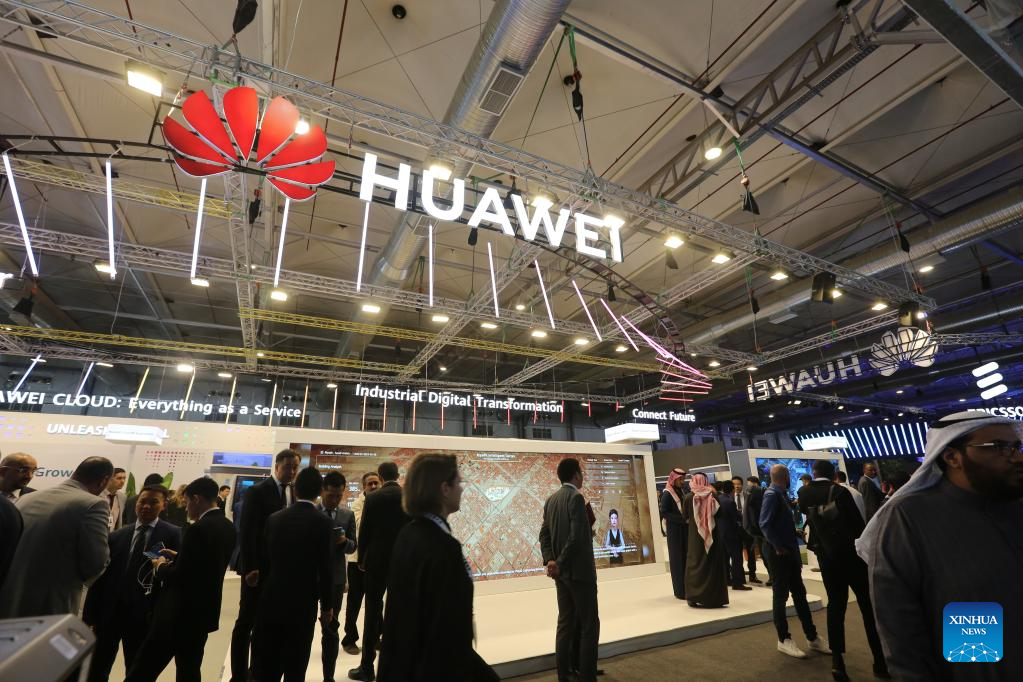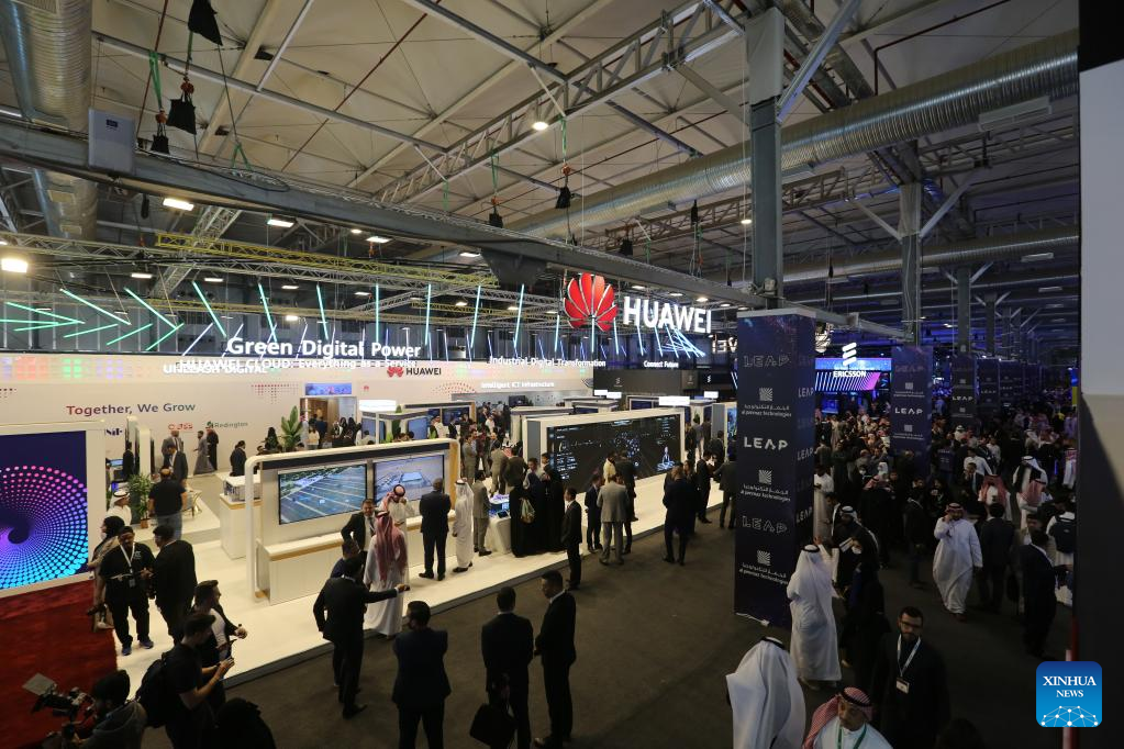 This photo taken on Feb. 6, 2023 shows Huawei's booth at the LEAP 2023, Saudi Arabia's largest and most comprehensive Information and Communications Technology exhibition in Riyadh, Saudi Arabia. Chinese tech giant Huawei has announced an investment of 400 million U.S. dollars to establish a cloud region in Saudi Arabia.