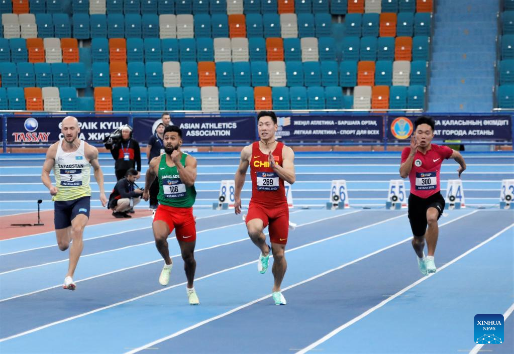VitaIiy Zems of Kazakhstan, Imranur Rahman of Bangladesh, Shi Yuhao of China and Cho kei Lam of China's Macao (L to R) compete during the men's 60m heats at the 10th Asian Indoor Athletics Championships in Astana, Kazakhstan, on Feb. 11, 2023. (Photo by Kalizhan Ospanov/Xinhua)