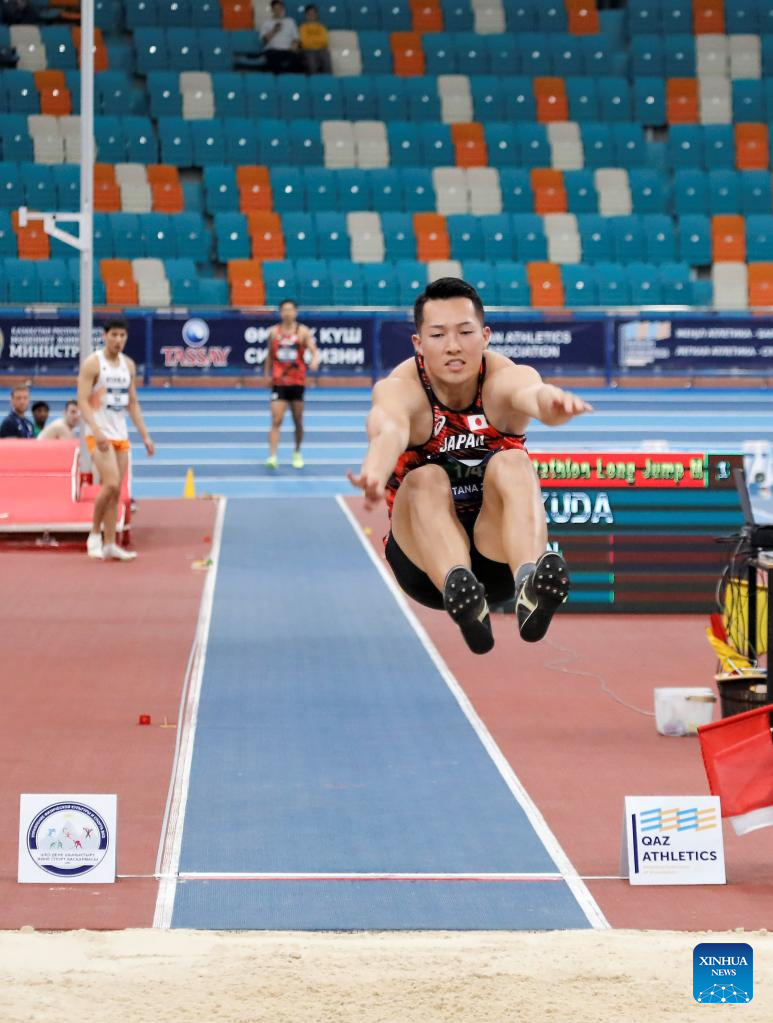 Okuda Keisuke of Japan competes during the long jump event of men's heptathlon at the 10th Asian Indoor Athletics Championships in Astana, Kazakhstan on Feb. 11, 2023. (Photo by Kalizhan Ospanov/Xinhua)