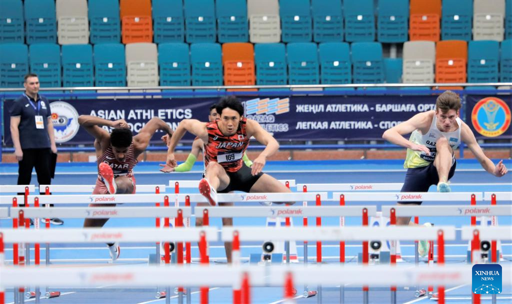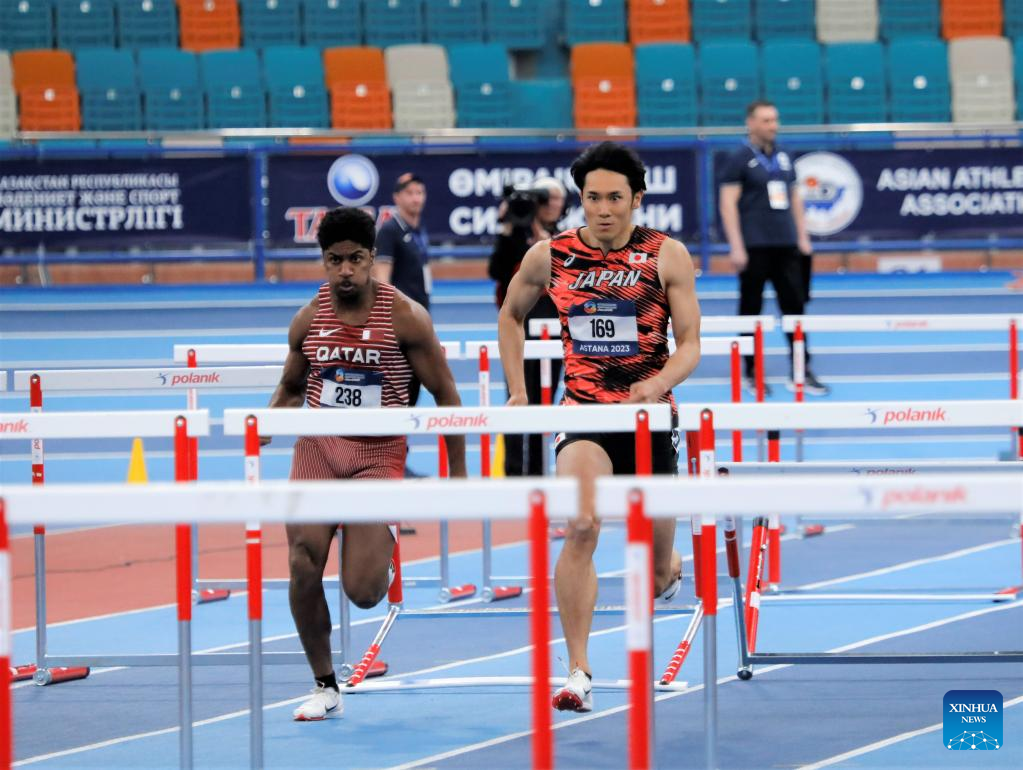 Ishikawa Shuhei (R) of Japan competes during the men's 60m hurdles heats at the 10th Asian Indoor Athletics Championships in Astana, Kazakhstan on Feb. 11, 2023. (Photo by Kalizhan Ospanov/Xinhua)