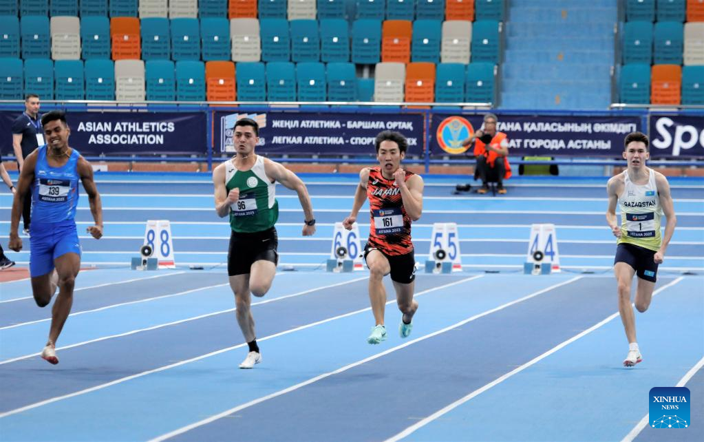 Maruyama Yuma of Japan, Choe Donghwi of South Korea and Okuda Keisuke of Japan (L to R) compete during the 60m of men's heptathlon at the 10th Asian Indoor Athletics Championships in Astana, Kazakhstan on Feb. 11, 2023. (Photo by Kalizhan Ospanov/Xinhua)