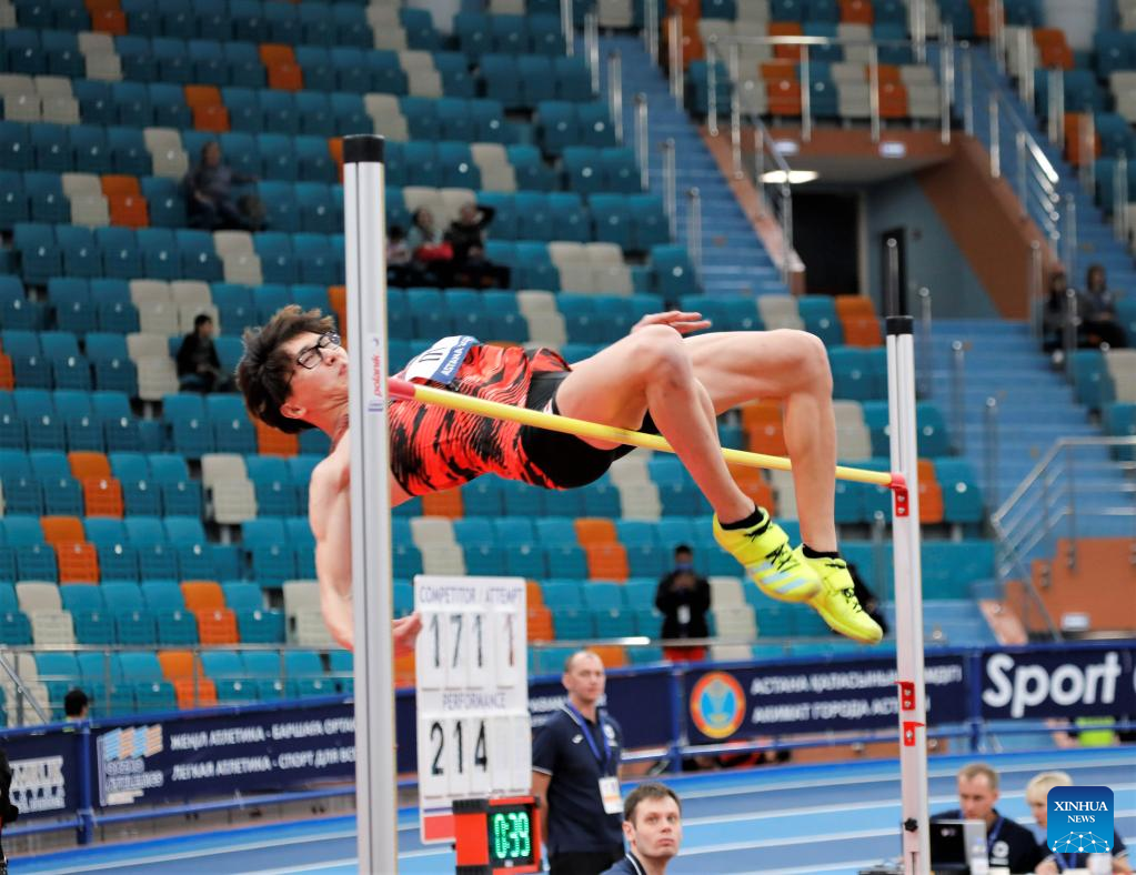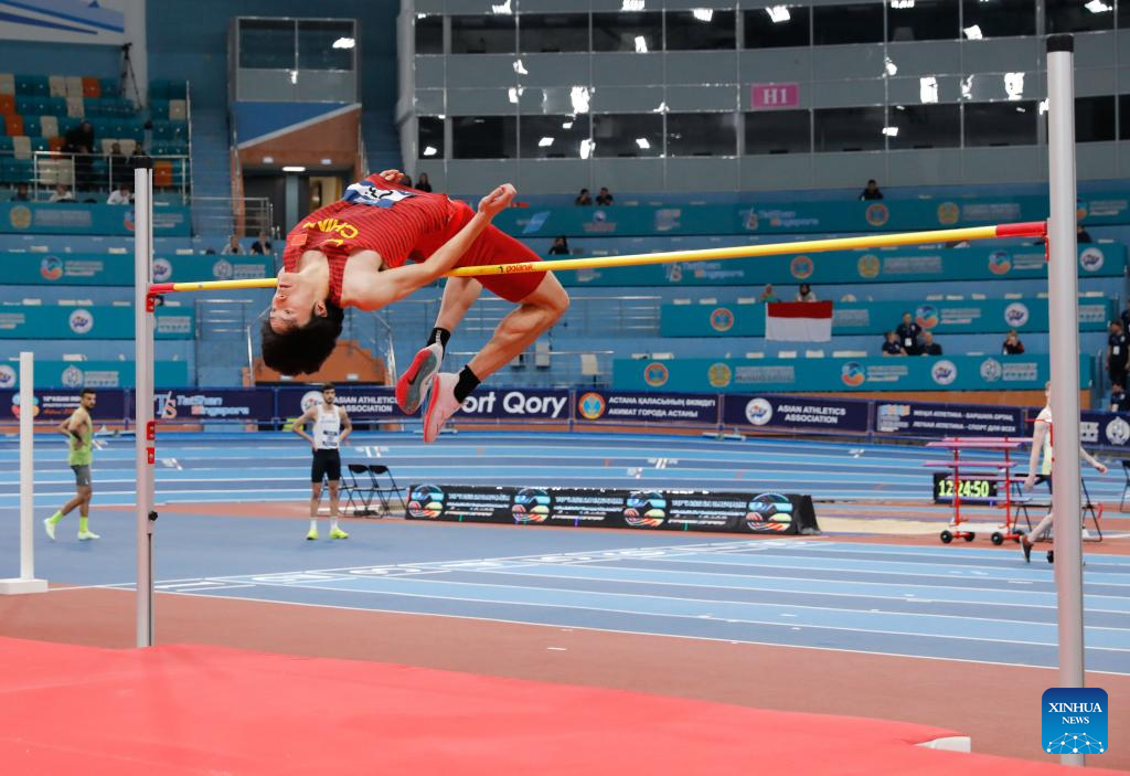 Wang Zhen of China competes during the men's high jump qualification at the 10th Asian Indoor Athletics Championships in Astana, Kazakhstan on Feb. 11, 2023. (Photo by Kalizhan Ospanov/Xinhua)