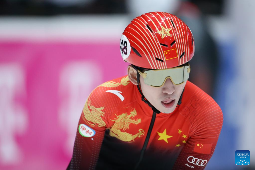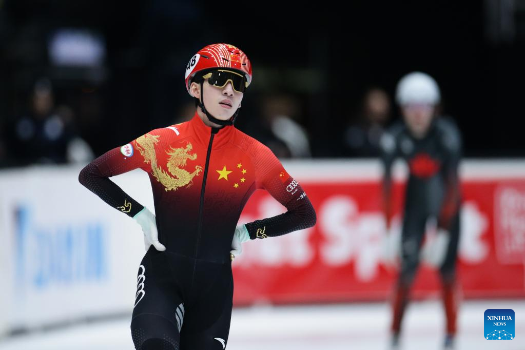 Lin Xiaojun of China reacts after the final B of men's 1000m (1) on the Day 1 of the 2022-2023 ISU World Cup Short Track Speed Skating series in Dordrecht, the Netherlands, Feb. 11, 2023. (Xinhua/Zheng Huansong)