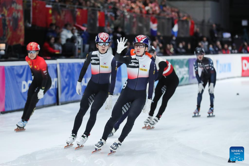 Park Ji Won (front R) of South Korea reacts after winning the final A of the men's 1500m on the Day 1 of the 2022-2023 ISU World Cup Short Track Speed Skating series in Dordrecht, the Netherlands, Feb. 11, 2023. (Xinhua/Zheng Huansong)