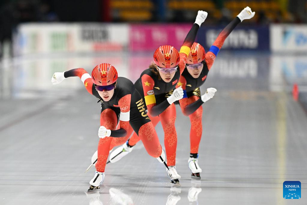 Team China compete during the women's team pursuit Division A race on the Day 2 of the 2022-2023 ISU Speed Skating World Cup in Tomaszow Mazowiecki, Poland, Feb. 11, 2023. (Photo by Jan Kowalski/Xinhua)