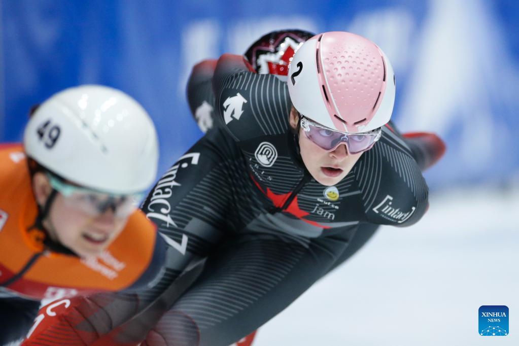 Kim Boutin (R) of Canada competes during the final A of the women's 1000m (1) on the Day 1 of the 2022-2023 ISU World Cup Short Track Speed Skating series in Dordrecht, the Netherlands, Feb. 11, 2023. (Xinhua/Zheng Huansong)
