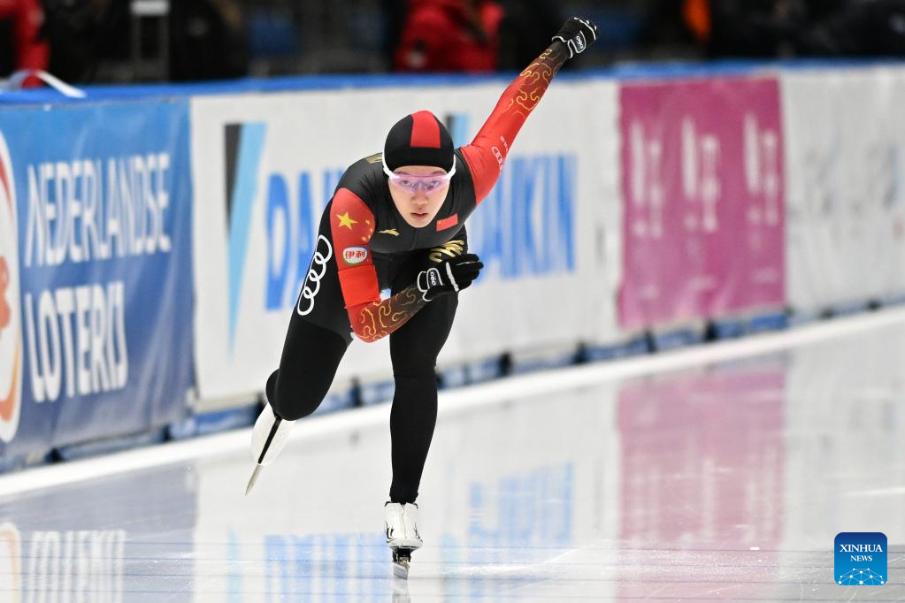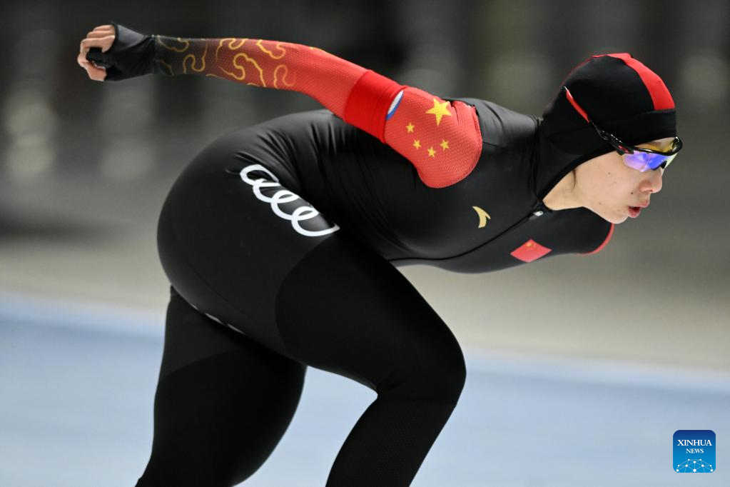 Li Qishi of China competes during the women's 1500m Division A race on the Day 2 of the 2022-2023 ISU Speed Skating World Cup in Tomaszow Mazowiecki, Poland, Feb. 11, 2023. (Photo by Jan Kowalski/Xinhua)