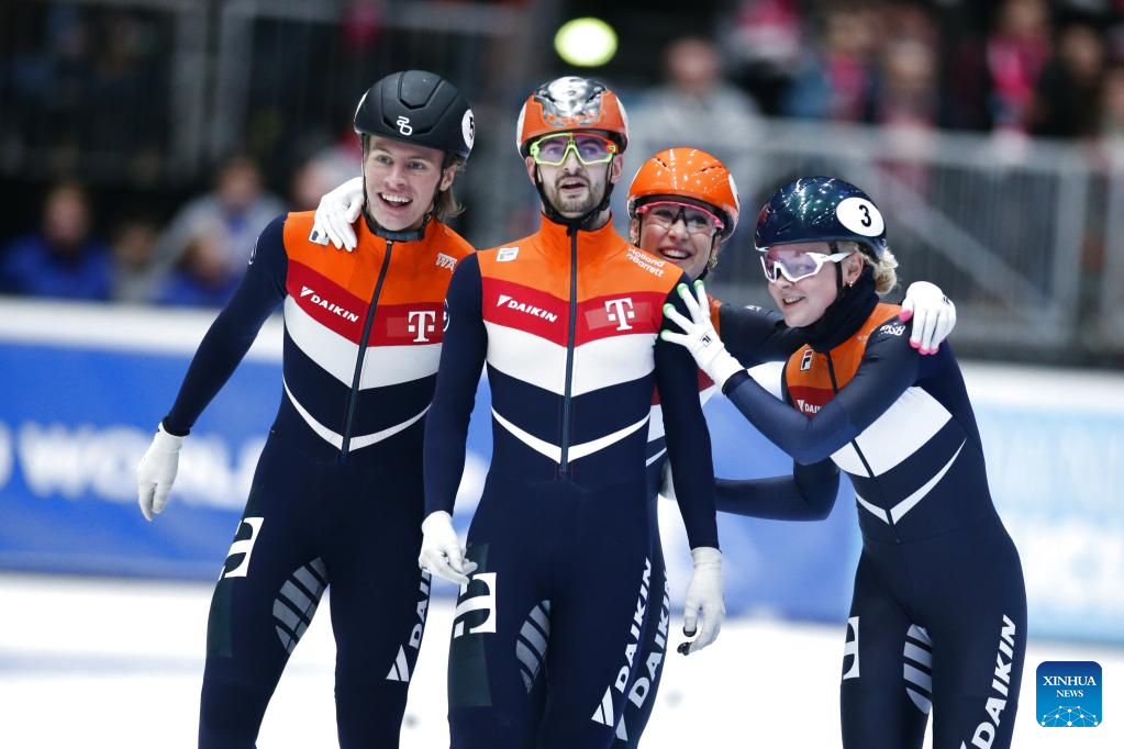 Team Netherlands celebrate after winning the final of mixed 2000m relay on the Day 1 of the 2022-2023 ISU World Cup Short Track Speed Skating series in Dordrecht, the Netherlands, Feb. 11, 2023. (Xinhua/Zheng Huansong)