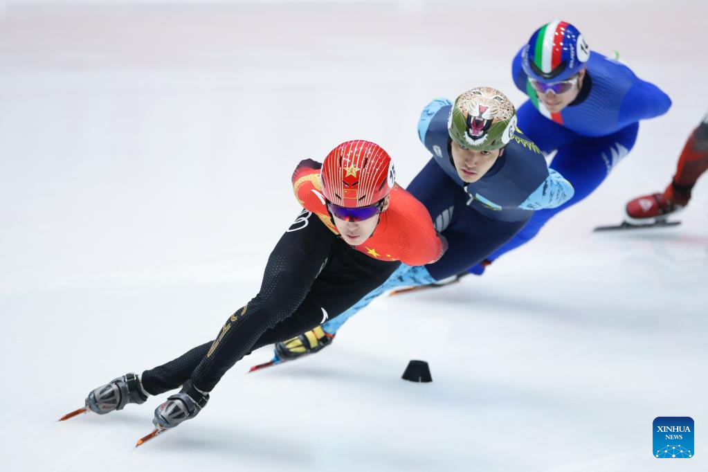 Li Wenlong (2nd R) of China competes during the final B of the men's 1500m on the Day 1 of the 2022-2023 ISU World Cup Short Track Speed Skating series in Dordrecht, the Netherlands, Feb. 11, 2023. (Xinhua/Zheng Huansong)