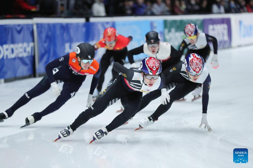 Park Ji Won (front C) of South Korea competes during the final A of the men's 1500m on the Day 1 of the 2022-2023 ISU World Cup Short Track Speed Skating series in Dordrecht, the Netherlands, Feb. 11, 2023. (Xinhua/Zheng Huansong)