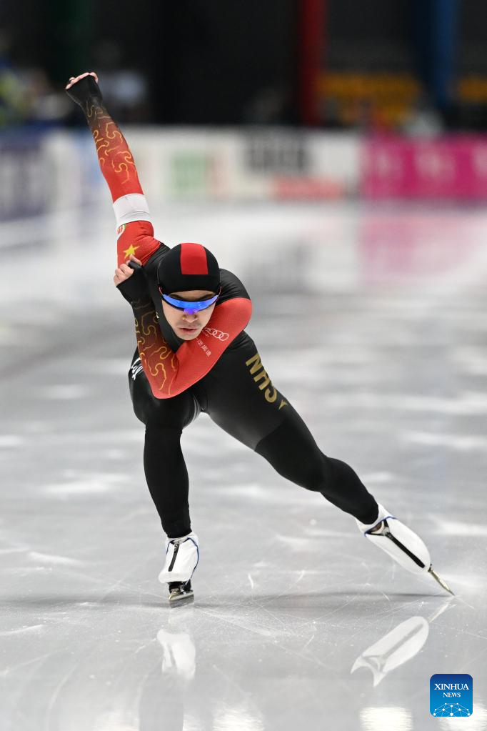 Ning Zhongyan of China competes during the men's 500m Division B race on the Day 2 of the 2022-2023 ISU Speed Skating World Cup in Tomaszow Mazowiecki, Poland, Feb. 11, 2023. (Photo by Jan Kowalski/Xinhua)