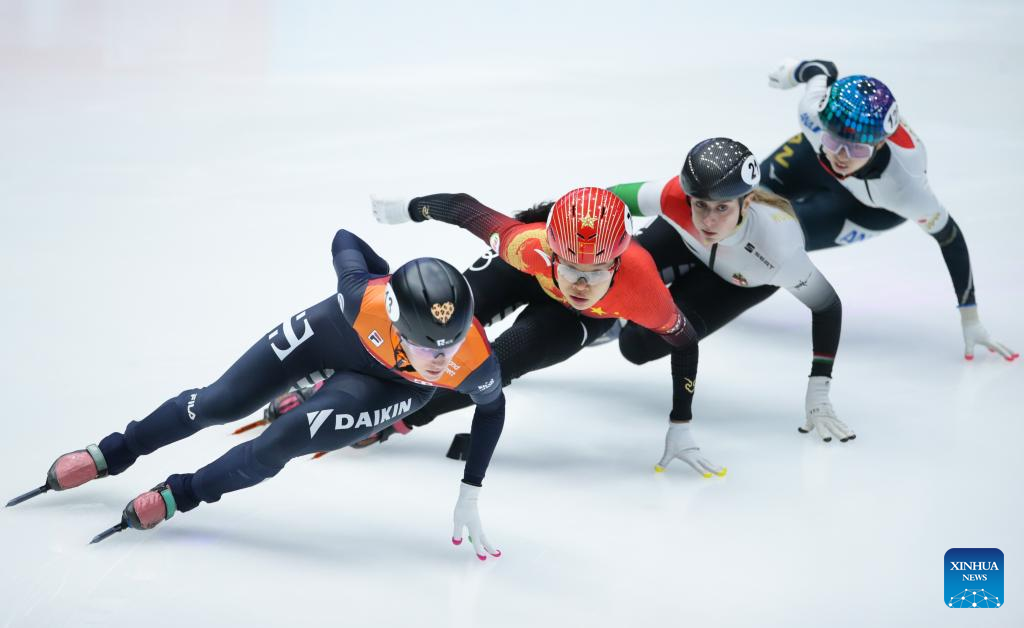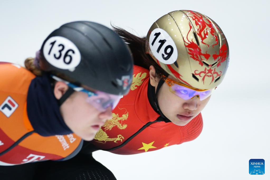 Wang Ye (R) of China competes during the final B of the women's 1000m (1) on the Day 1 of the 2022-2023 ISU World Cup Short Track Speed Skating series in Dordrecht, the Netherlands, Feb. 11, 2023. (Xinhua/Zheng Huansong)