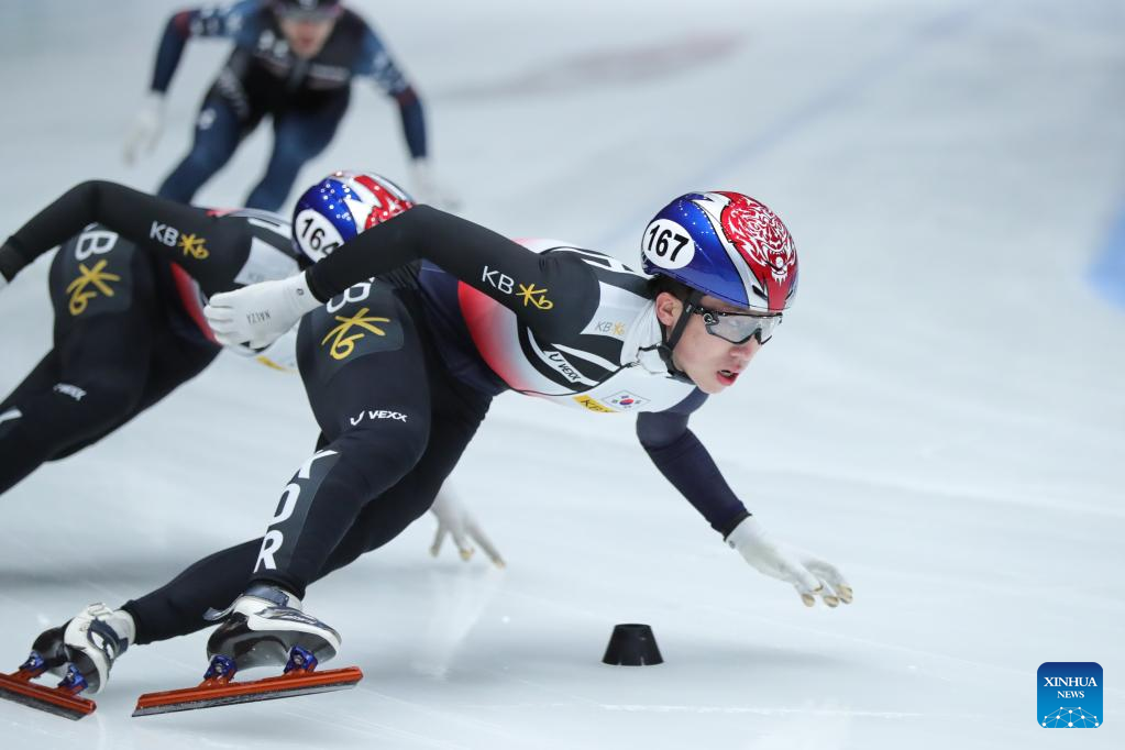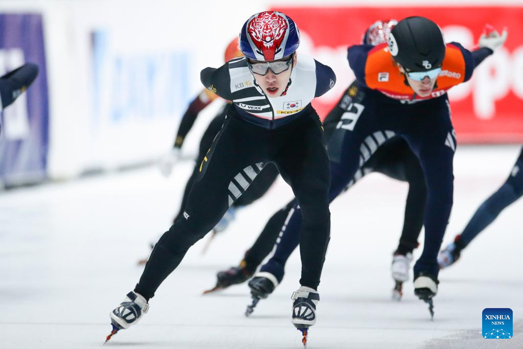 Park Ji Won of South Korea competes during the final A of the men's 1500m on the Day 1 of the 2022-2023 ISU World Cup Short Track Speed Skating series in Dordrecht, the Netherlands, Feb. 11, 2023. (Xinhua/Zheng Huansong)