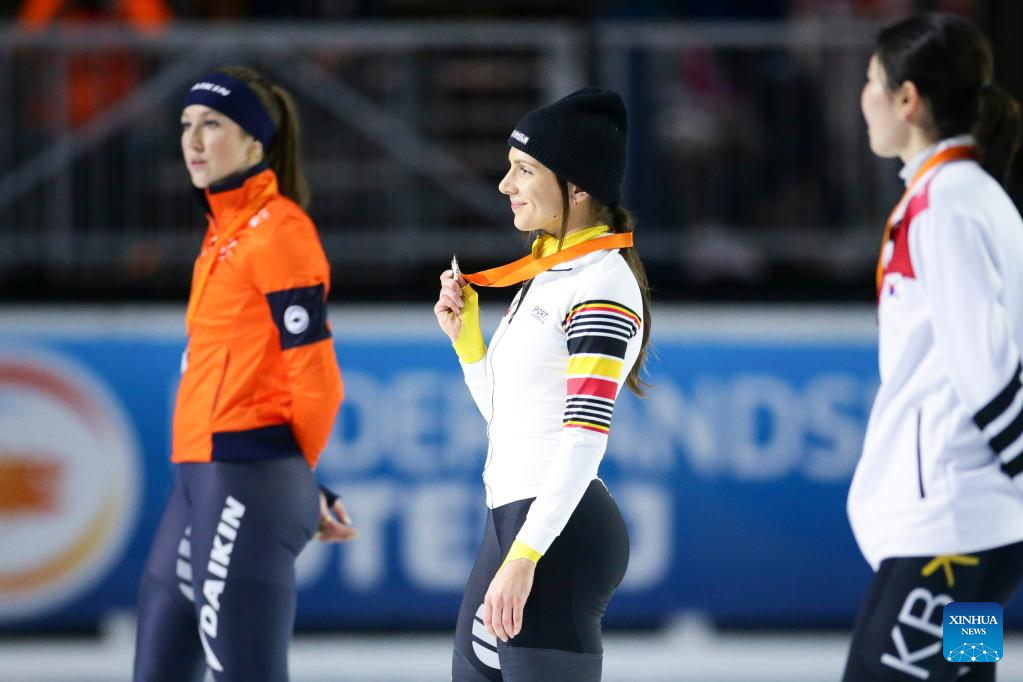 Hanne Desmet (C) of Belgium poses with her gold medal after winning the final A of the women's 1500m on the Day 1 of the 2022-2023 ISU World Cup Short Track Speed Skating series in Dordrecht, the Netherlands, Feb. 11, 2023. (Xinhua/Zheng Huansong)