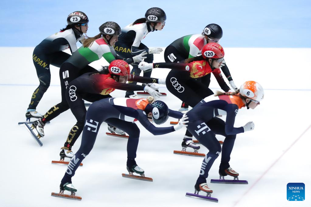 Skaters compete during the semifinal of the women's 3000m relay on the Day 1 of the 2022-2023 ISU World Cup Short Track Speed Skating series in Dordrecht, the Netherlands, Feb. 11, 2023. (Xinhua/Zheng Huansong)