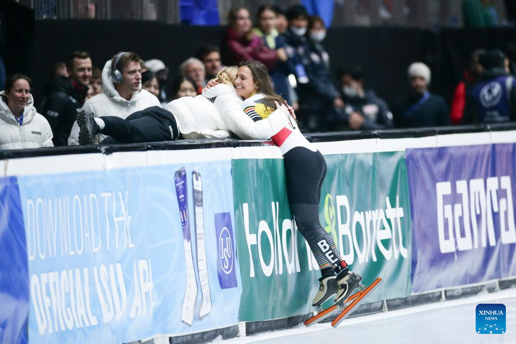 Hanne Desmet of Belgium reacts after winning the final A of the women's 1500m on the Day 1 of the 2022-2023 ISU World Cup Short Track Speed Skating series in Dordrecht, the Netherlands, Feb. 11, 2023. (Xinhua/Zheng Huansong)