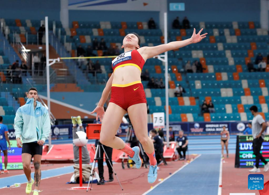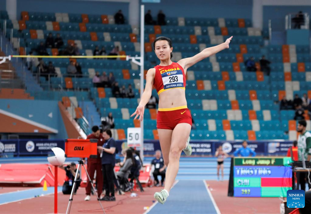 Gong Luying of China competes during the women's long jump final at the 10th Asian Indoor Athletics Championships in Astana, Kazakhstan, Feb. 12, 2023. (Photo by Kalizhan Ospanov/Xinhua)