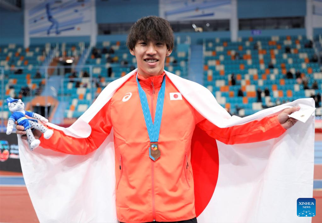 Bronze medalist Suzuki Ryota of Japan poses during the awarding ceremony of the men's 60M event at the 10th Asian Indoor Athletics Championships in Astana, Kazakhstan, Feb. 12, 2023. (Photo by Kalizhan Ospanov/Xinhua)