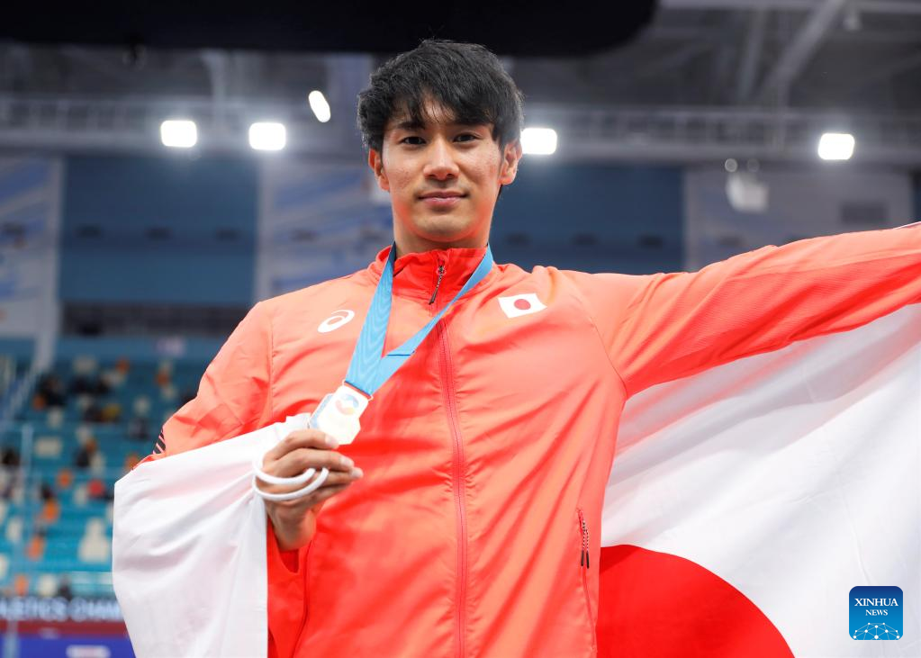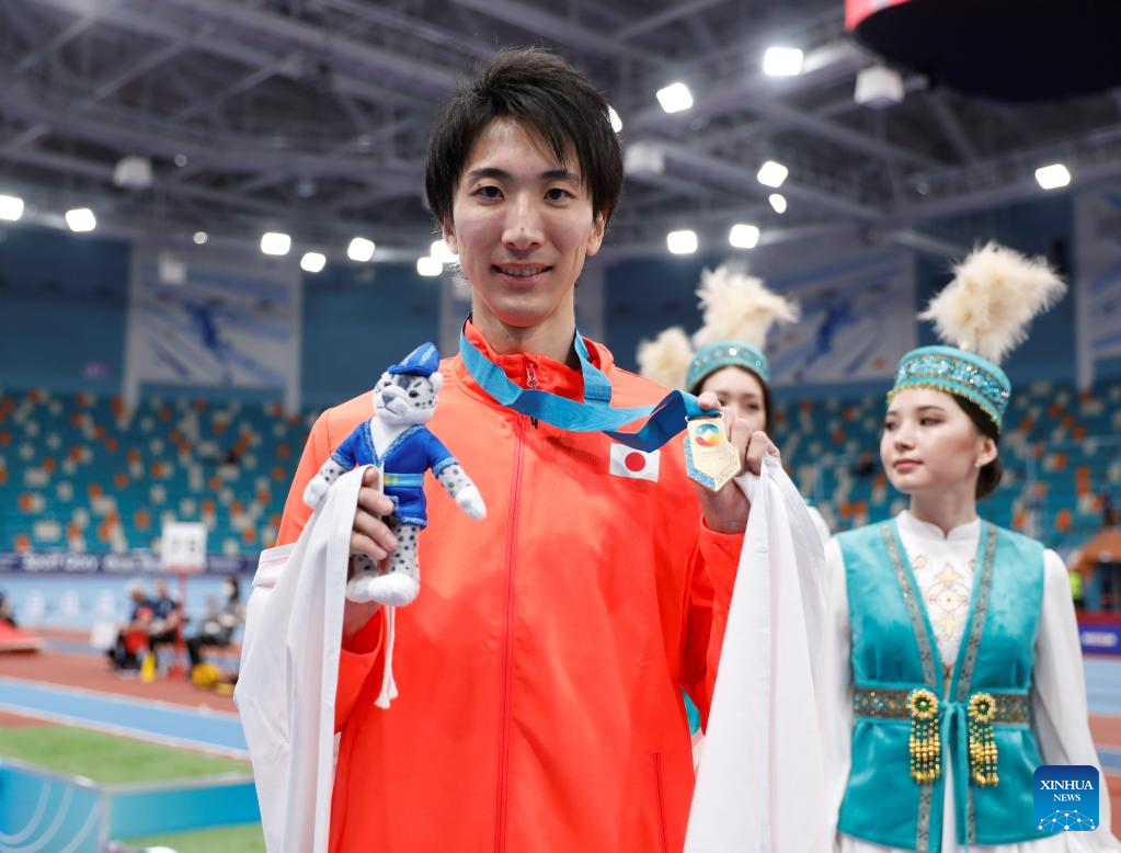 Gold medalist Akamatsu Ryoichi Japan pose during the awarding ceremony after the men's high jump final at the 10th Asian Indoor Athletics Championships in Astana, Kazakhstan, Feb. 12, 2023. (Photo by Kalizhan Ospanov/Xinhua)