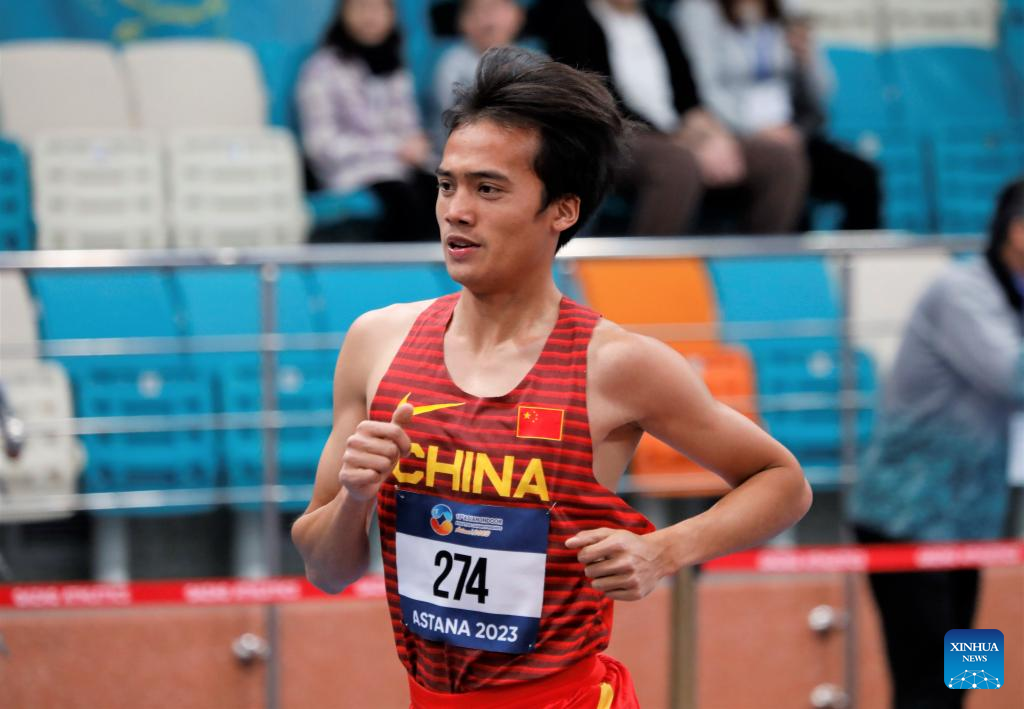 Wang Fudong of China competes during the men's 3000m final at the 10th Asian Indoor Athletics Championships in Astana, Kazakhstan, Feb. 12, 2023. (Photo by Kalizhan Ospanov/Xinhua)