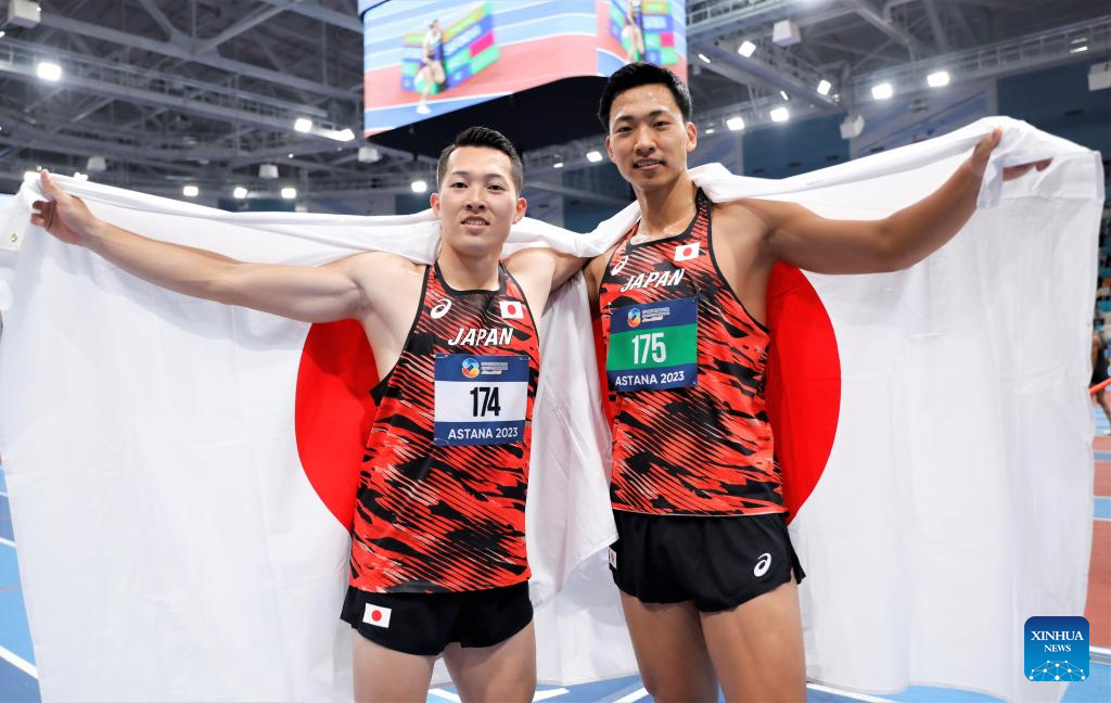 Maruyama Yuma (R) and Okuda Keisuke of Japan pose after the 1000m event of the men's Heptathlon at the 10th Asian Indoor Athletics Championships in Astana, Kazakhstan, Feb. 12, 2023. (Photo by Kalizhan Ospanov/Xinhua)