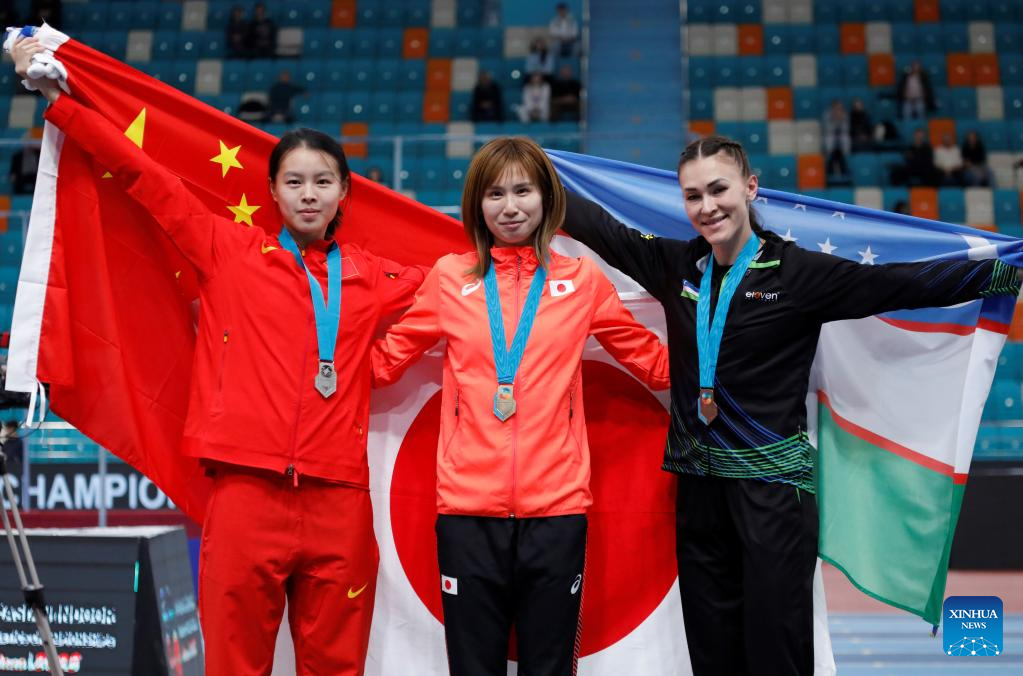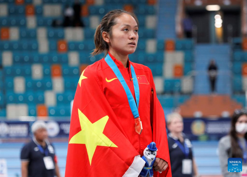Chen Jiamin of China pose during the awarding ceremony after the women's 60M hurdles final at the 10th Asian Indoor Athletics Championships in Astana, Kazakhstan, Feb. 12, 2023. (Photo by Kalizhan Ospanov/Xinhua)