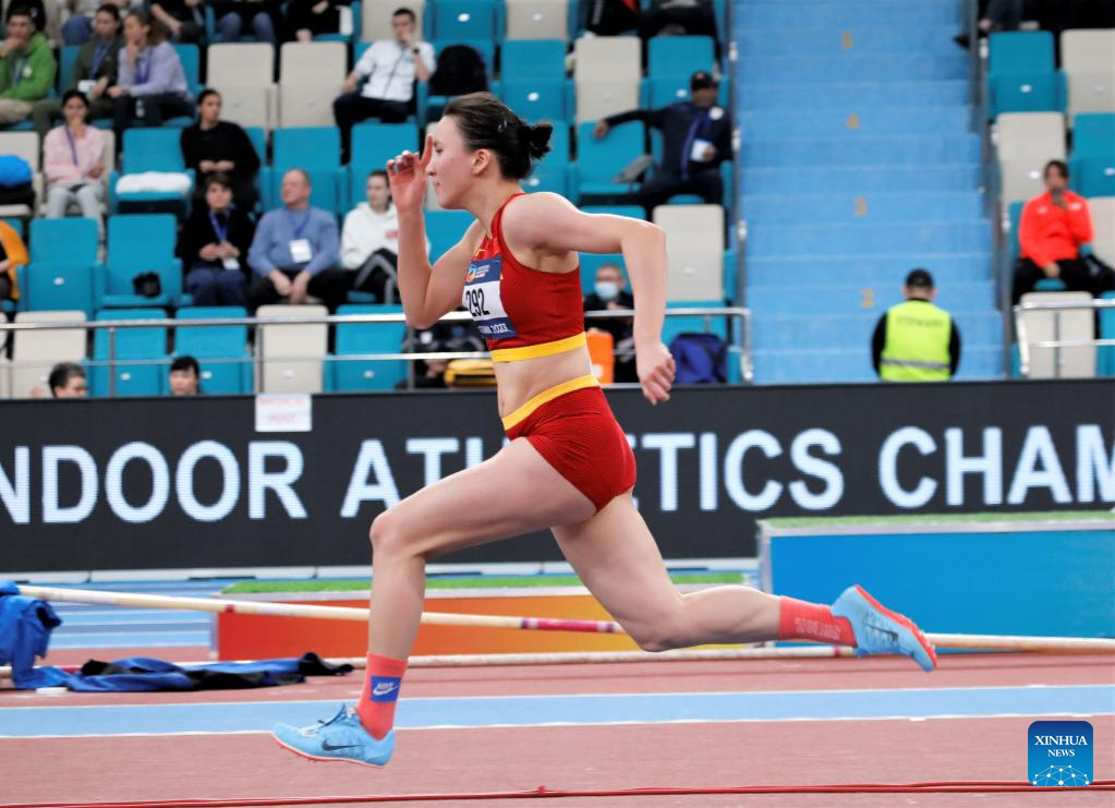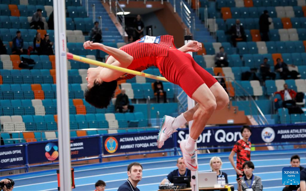 Wang Zhen of China competes during the men's high jump final at the 10th Asian Indoor Athletics Championships in Astana, Kazakhstan, Feb. 12, 2023. (Photo by Kalizhan Ospanov/Xinhua)