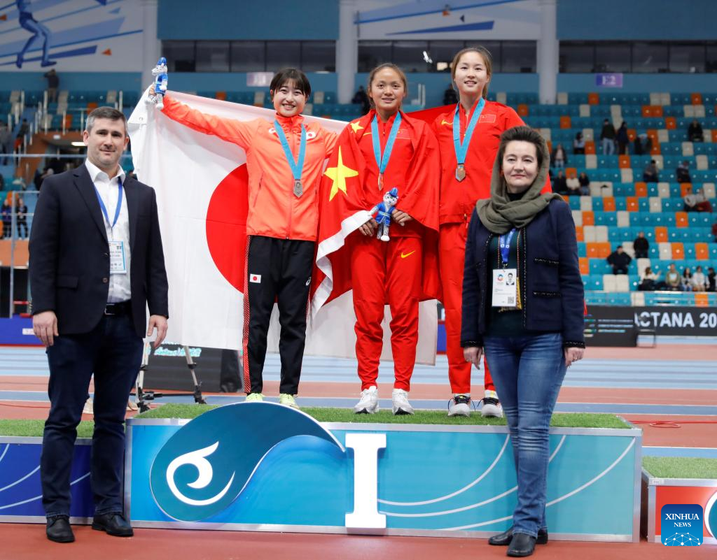 (from L to R) Huang Yingying of China, Hata Sumire of Japan and Darya Reznichenko of Uzbekistan pose during the awarding ceremony after the women's long jump final at the 10th Asian Indoor Athletics Championships in Astana, Kazakhstan, Feb. 12, 2023. (Photo by Kalizhan Ospanov/Xinhua)