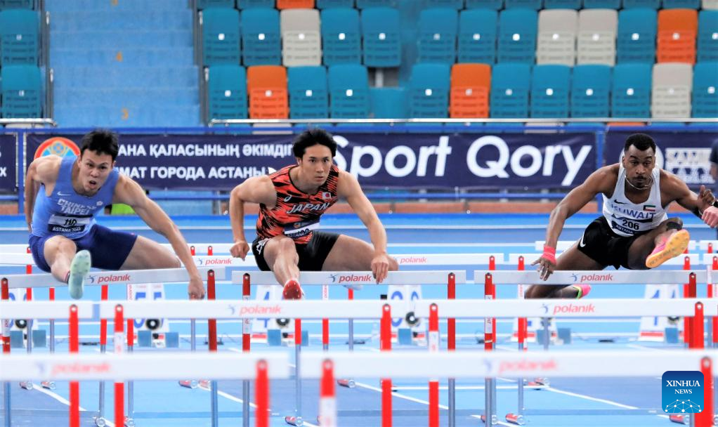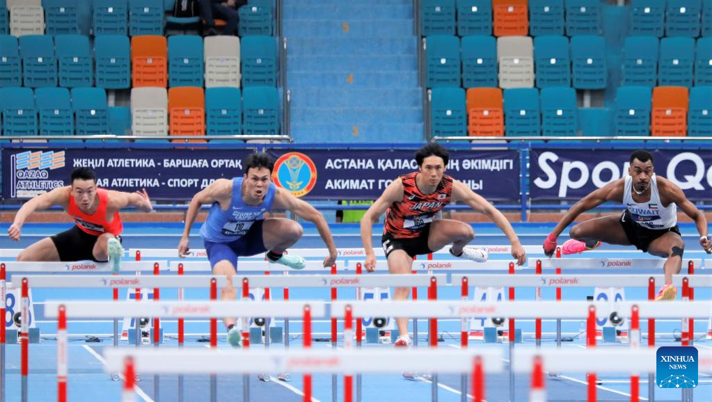 Ishikawa Shuhei (C) of Japan competes during the men's 60m hurdles final at the 10th Asian Indoor Athletics Championships in Astana, Kazakhstan, Feb. 12, 2023. (Photo by Kalizhan Ospanov/Xinhua)