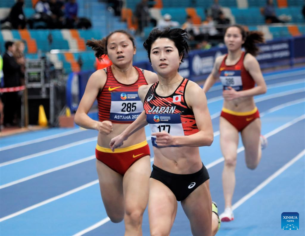 Shiomi Ayano (front) of Japan competes during the women's 800m final at the 10th Asian Indoor Athletics Championships in Astana, Kazakhstan, Feb. 12, 2023. (Photo by Kalizhan Ospanov/Xinhua)