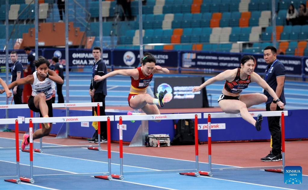 Chen Jiamin (2nd R) of China competes during the women's 60M hurdles final at the 10th Asian Indoor Athletics Championships in Astana, Kazakhstan, Feb. 12, 2023. (Photo by Kalizhan Ospanov/Xinhua)