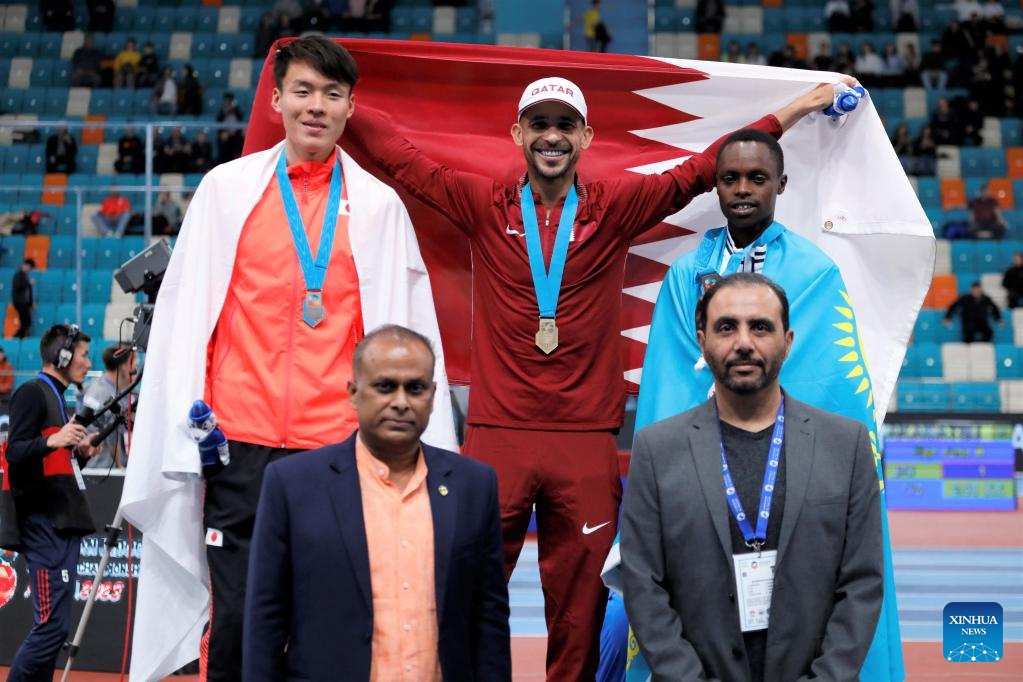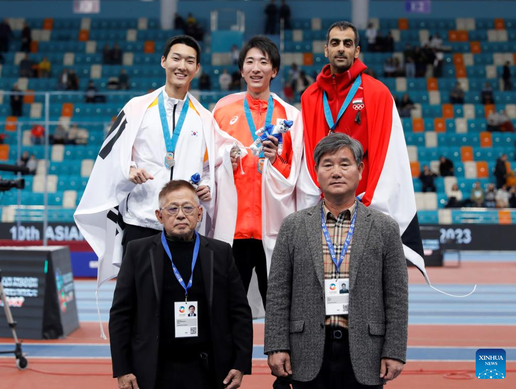 (from L to R, top) Silver medalist Woo Sanghyeok of South Korea, gold medalist Akamatsu Ryoichi of Japan and bronze medalist Majd Eddin Ghazal of Syria pose during the awarding ceremony after the men's high jump final at the 10th Asian Indoor Athletics Championships in Astana, Kazakhstan, Feb. 12, 2023. (Photo by Kalizhan Ospanov/Xinhua)