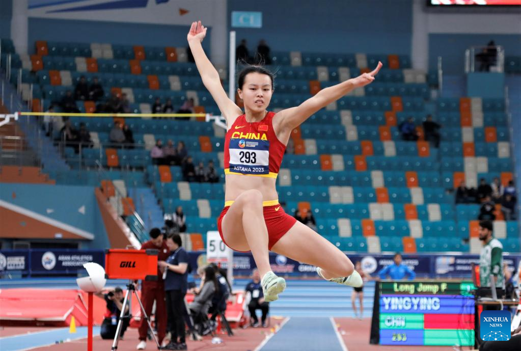 Huang Yingying of China competes during the women's long jump final at the 10th Asian Indoor Athletics Championships in Astana, Kazakhstan, Feb. 12, 2023. (Photo by Kalizhan Ospanov/Xinhua)